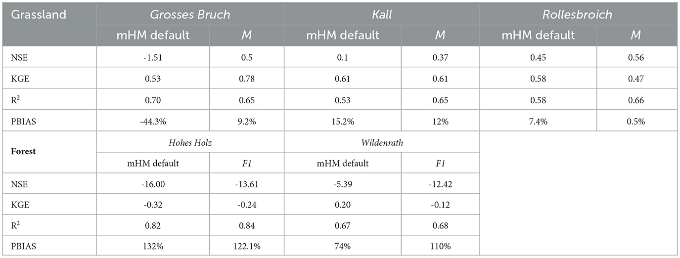We preferred NSE as an objective function to constrain the model parameters based on neutron counts measurements because it evaluates how well the model captures the variability in the observed data, rather than just matching the mean or total volume. A cross-validation experiment was performed using independent data sets from five test sites to further demonstrate the generality and/or transferability of the presented modeling scheme: Grosses Bruch (grassland), Hohes Holz (forest), Kall (grassland), Rollesbroich (grassland), and Wildenrath (forest). The calibrated parameter sets from the primary study sites (railway segment between Blankenburg-Rübeland) of the site F1 and M were transferred and applied to these test locations to assess model transferability. This was done by extracting the 10 optimized parameter sets and making decisions on model reliability based on cross-validation results. To further evaluate our results, we utilized the mHM simulations established by Boeing et al. (2022) as a default (reference) mHM simulation. We initially tested the mHM parameters using the GDM setup by Boeing et al. (2022), which were calibrated against streamflow using a multi-basin approach optimized with KGE and the DDS algorithm across 201 catchments. Notably the German drought monitor (GDM) setup https://www.ufz.de/index.php?en=37937 uses Boeing et al. (2022) as a reference and this will allow us to quantify the improvements achieved in our approach relative to those employed by the GDM.