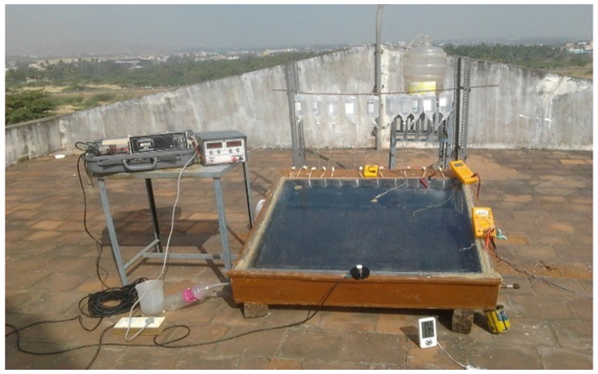 The experimental process was carried out at the Solar Energy Research Laboratory, KLEF University, Vaddeswaram, Guntur District, Andhra Pradesh, India. The site is geographically positioned at approximately 16.4880° N latitude and 80.6480° E longitude. During the observation period (1–30 May 2025), the average solar irradiance was recorded to be around 751 W/m2, using a Kipp and Zonen CMP11 pyranometer for accurate measurement (Abdullah et al., 2022). The mean relative humidity throughout the study duration was about 33%. According to the Köppen climate classification, Vaddeswaram falls under the Tropical Savanna (Aw) category, which is typically marked by clearly defined wet and dry seasons. Experimental error analysis of the solar still is calculated in Table 1.