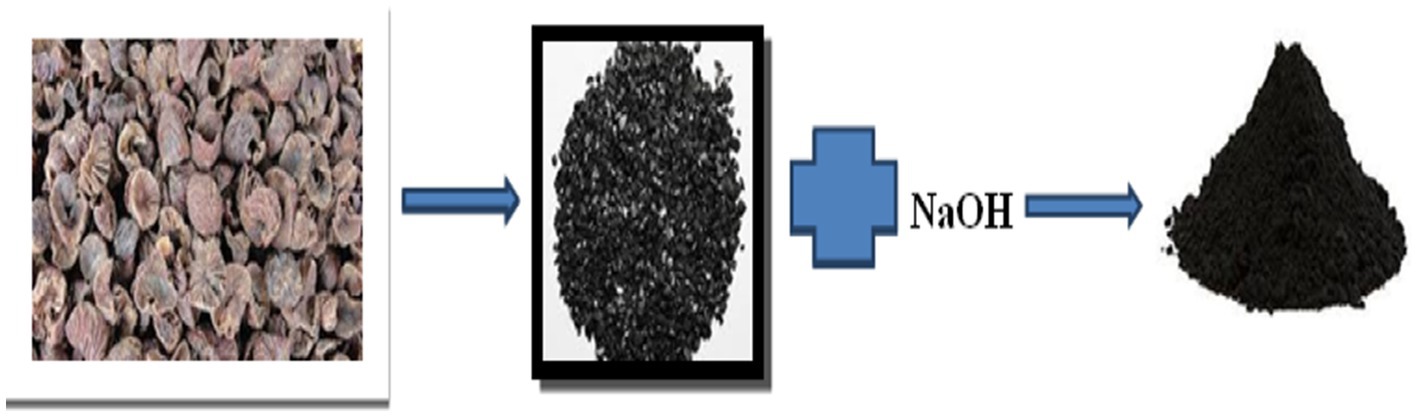 A widely available and environmentally beneficial agricultural waste material, arecanut shells, was used in the manufacture of activated carbon. To guarantee that all surface and intrinsic moisture content was removed, fresh arecanut shells were first gathered and allowed to air-dry for 2 days. For pyrolysis to be effective and to produce a high-quality carbon output, this drying stage is essential. After drying, pyrolysis, a thermal breakdown process carried out without oxygen, was applied to the shells. For roughly 2–3 h, the pyrolysis was carried out in a controlled muffle furnace at temperatures between 400 and 500°C. This caused the volatile organic chemicals to break down, resulting in the formation of carbonized material. Complete carbonization was verified by a structural and optical examination, as evidenced by the material’s uniform black color and friability. The carbonized arecanut shells were manually crushed and ground into a fine powder using a mortar and pestle to decrease the particle size and avoid aggregation. The resultant powder was appropriate for adsorption-based applications due to its high surface area and porous structure. Chemical activation, a crucial process to increase the carbon’s surface area and porosity, was the following stage. Since sodium hydroxide (NaOH) effectively creates micropores (Asha et al., 2022), it was chosen as the activating agent. To guarantee uniform mixing, a NaOH solution was added to the fine carbon powder in a 1:3 weight ratio (carbon: NaOH) and thoroughly mixed. To allow for complete chemical interaction and pore development, this mixture was left at room temperature for 12 h. Following soaking, the mixture underwent a second heat treatment (activation) for 2 h at about 700°C in a muffle furnace, which enhanced surface activation and promoted additional porosity growth. After cooling, the activated carbon was regularly cleaned with 0.1 M HCl and deionized water to remove any remaining chemicals and balance the pH. The finished product was kept in airtight containers for later use after being dried overnight at 110°C in a hot air oven.