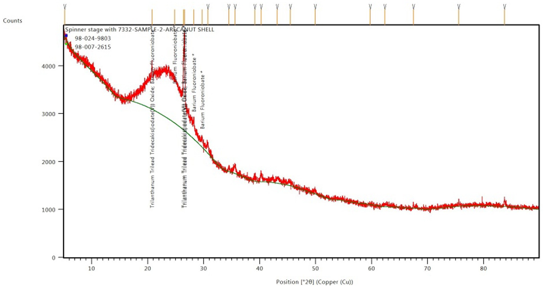 The structural characteristics of the synthesized activated carbon were characterized by X-ray diffraction (XRD) analysis, as illustrated in Figure 3. The amorphous or semi-crystalline structure of the observed broad diffraction peak, which is centered at 2Ɵ = 24°, is characteristic of carbonaceous materials that have undergone thermal treatment. A disorderly arrangement of carbon atoms, which is advantageous for adsorption because it contains more active sites, is implied by the absence of distinct peaks (Shanmugan et al., 2020). The average crystallite dimension was determined using the Debye–Scherrer equation, which links peak broadening with crystallite size. Using a form factor (K) of 0.9, the crystallite size was determined to be roughly 89.7 nm, supporting the assumption that the carbon structure remains amorphous, yet exhibits nanoscale characteristics.