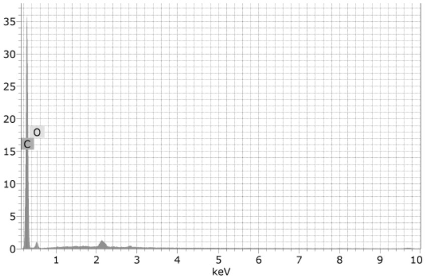 The morphological properties of the activated carbon are further supported by Scanning Electron Microscopy (SEM) pictures (Figure 5). The pictures show an uneven, flaky surface with a lot of porosity, which shows that a micro- and mesoporous structure was successfully formed during activation. These pores increase the material’s adsorption capacity by giving contaminating molecules multiple paths and binding sites. Additionally, mechanical resilience is suggested by the shape, which is beneficial for recurrent use in water treatment systems (Panchal et al., 2021). It is found that the successful synthesis of activated carbon with a large surface area, amorphous microstructure, and advantageous chemical properties is confirmed by the combined XRD, SEM, and EDX investigations. These characteristics are essential for creating economical and effective adsorbents for environmental remediation applications, especially in water purification and desalination systems.
