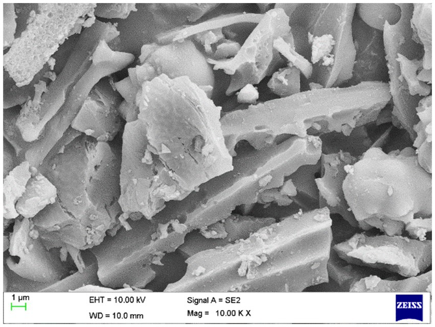 The ZnO–Activated Carbon (ZnO–AC) composite was made by physically mixing the synthesized ZnO nanoparticles with the activated carbon in various weight ratios (1:1, 1:2, and 2:1) to examine the impact of composition on performance. A ball mill or the magnetic stirring methods were used for the physical mixing (Panchal et al., 2021). To guarantee that the ZnO particles were evenly distributed throughout the carbon matrix, the appropriate amounts of ZnO and activated carbon were dissolved in ethanol and constantly agitated for four to 6 h (Kumar et al., 2021). The resulting slurry was mixed, filtered, dried at 100°C, and then finely powdered. The ZnO–AC nanocomposite was utilized for additional characterizations, including SEM, XRD, Energy-Dispersive X-ray Analysis (EDAX) spectroscopy, and adsorption or photocatalytic performance investigation, after being kept in a desiccator to stop moisture absorption. As shown in Figure 2, the conversion of carbonized biomass into activated carbon entails a notable decrease in particle size and an increase in porosity, both of which are critical for raising the material’s adsorption efficiency. In water purification applications, the activation process increases the surface area and pore volume by introducing physical and chemical changes that make it easier to capture contaminants. This is especially crucial for treating saline water since dissolved contaminants must be removed using efficient adsorption processes.