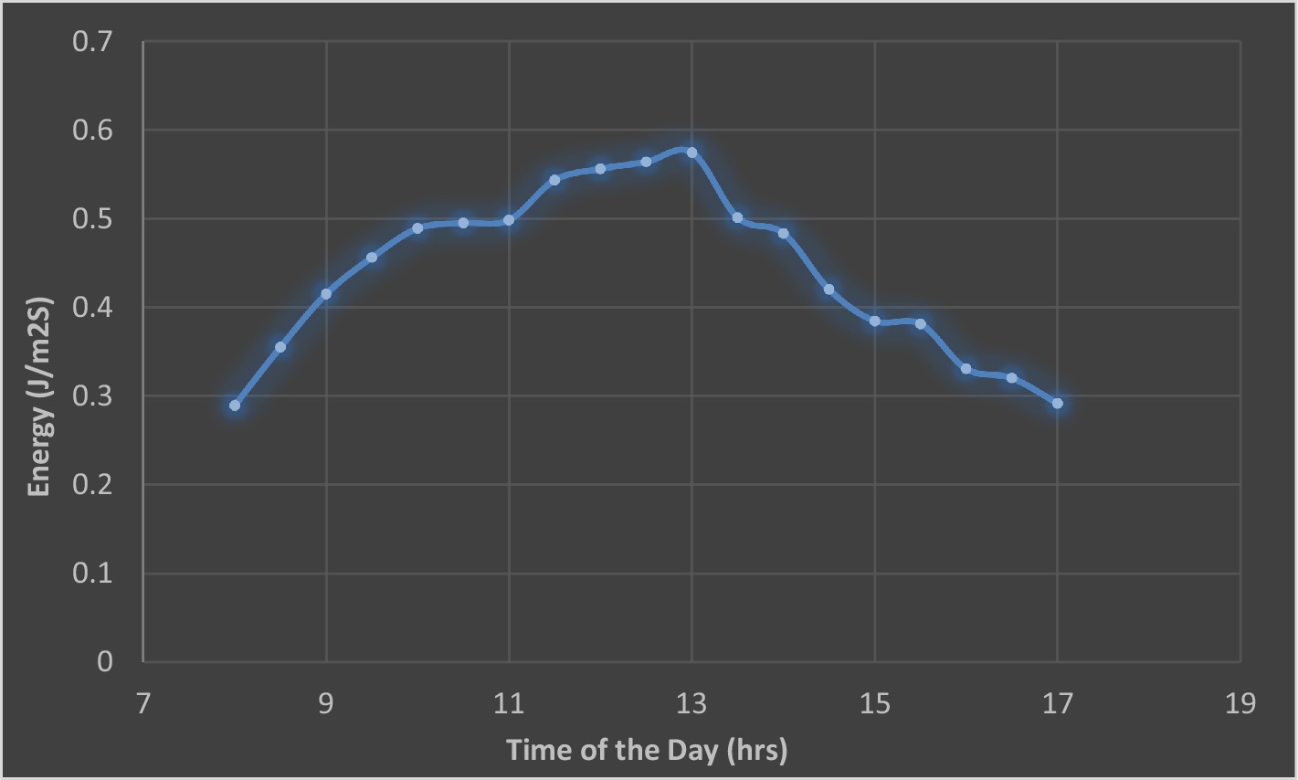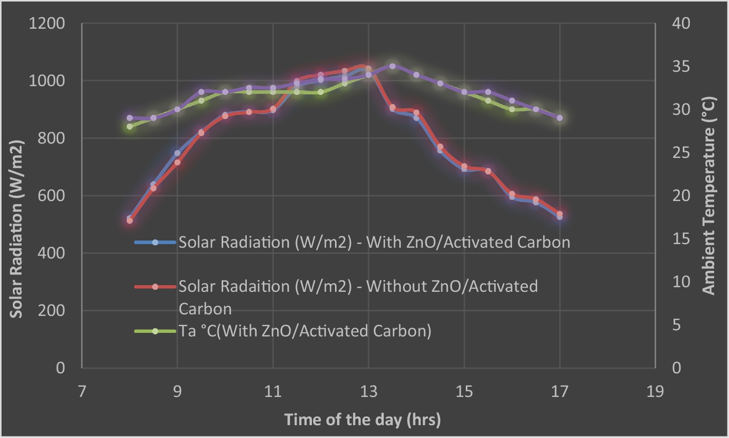The ZnO nanoparticles and activated carbon, strategically integrated within the wick’s evaporative surface, efficiently capture and assimilate the impinging solar irradiance that permeates the transparent glass cover. Concurrently, the activated carbon component functions as an adsorbent for dissolved ionic species present in the saline feed water, thereby significantly improving the distillate’s purity. Figure 7 delineates the aggregate radiative uptake and adsorption characteristics of the ZnO and activated carbon nanocomposite. Maximal energy assimilation was recorded during a 30-min temporal window, specifically from 12:30 to 1:00 p.m. simultaneously; the FRET mechanism orchestrates efficient energy transduction within the system (Elsheikh et al., 2022). This enables the ZnO nanoparticles to harvest photonic energy both directly from the incident solar flux and indirectly via energy transfer from the proximally located activated carbon.