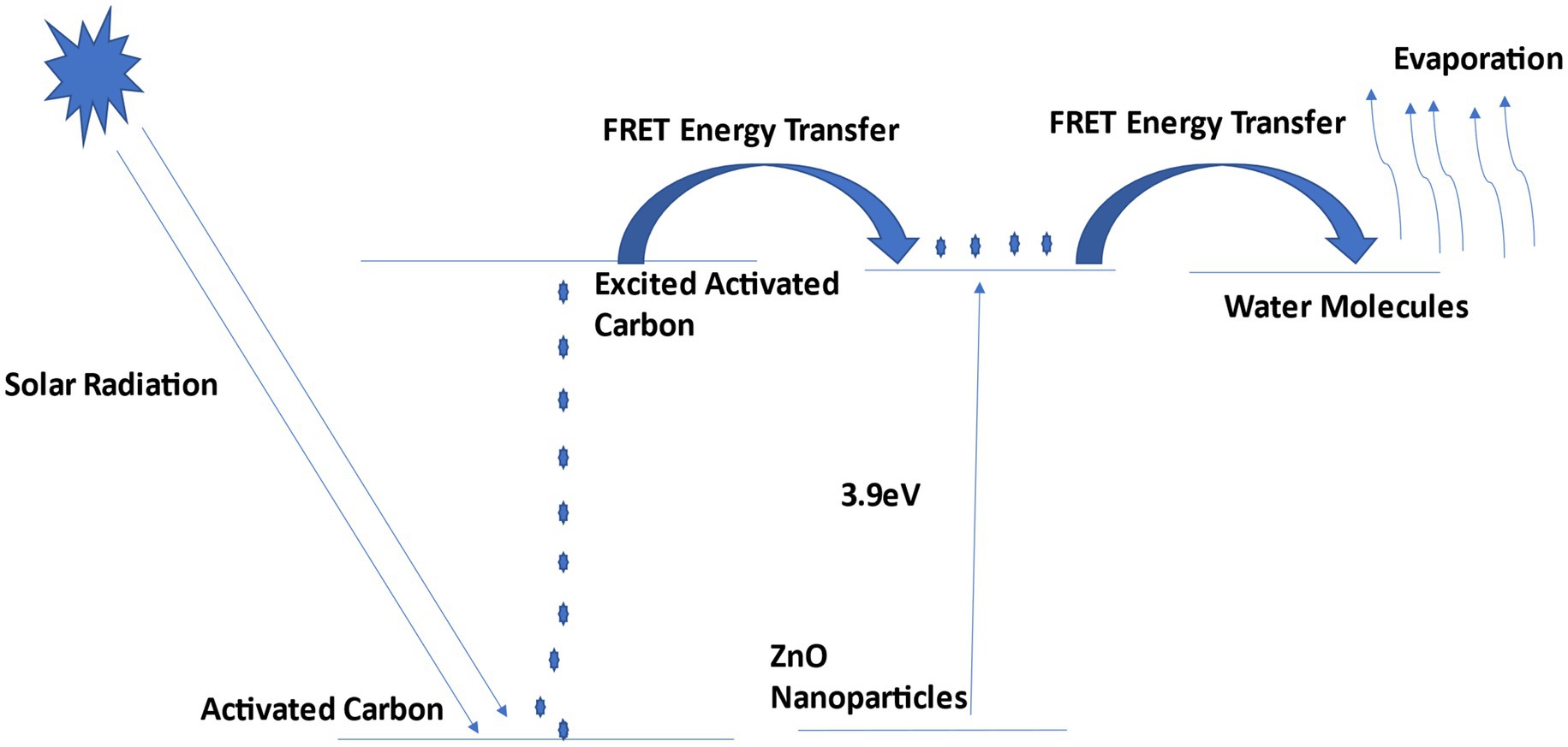 In this study, ZnO nanoparticles are synthesized sustainably utilizing green chemistry principles. At the same time, activated carbon is created by thermochemically converting biomass from mango wood, then chemically activating it with NaOH. The resultant nanoparticles are evenly distributed throughout the brine chamber of a solar distillation unit that uses a single-slope wick. Parallel to this, paraffin wax is placed under the corrugated wick absorber in a specific location to act as a PCM and allow for prolonged heat discharge at night. The cumulative freshwater yield during nighttime operation is greatly increased by the latent heat generated during the exothermic phase transition of the PCM. The system undergoes a thorough thermo-optical assessment, with a focus on clarifying how FRET contributes to the thermal energy transfer from the implanted ZnO/activated carbon hybrid to the saline medium. Although nanomaterials and PCMs have been studied separately in the literature to increase the efficiency of solar stills, nothing is known about the combined use of ZnO nanoparticles, activated carbon, and FRET-assisted energy coupling in a single distillation framework. To improve solar absorption, heat retention, and water purification effectiveness, this study presents a novel composite configuration that takes advantage of the complementary qualities of each component: FRET’s non-radiative energy mediation capability, activated carbon’s high surface area and adsorptive potential, and ZnO’s superior photothermal and photocatalytic functionality. The improved method creates a strong foundation for the development of high-efficiency solar thermal water purification technologies in addition to filling a significant research gap in solar desalination.