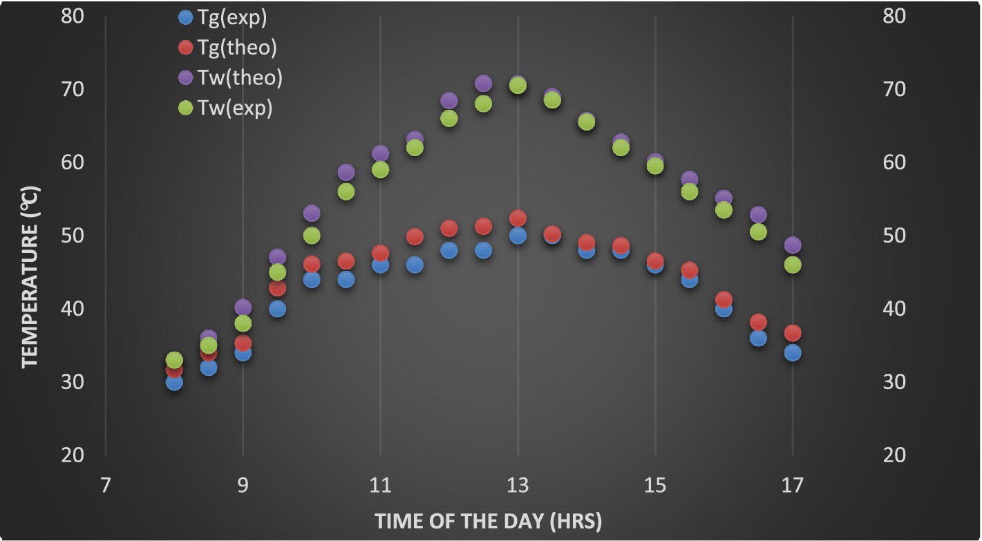 Analytical solution for the Tw − Tg inside angled; floating wick surfaces is shown in Figure 9. This theoretical model has been rigorously validated against experimental observations, demonstrating a strong conjoint trend and minimal discrepancy. This congruence substantiates the model’s suitability for predictive simulations in solar still applications operating under analogous climatic conditions.