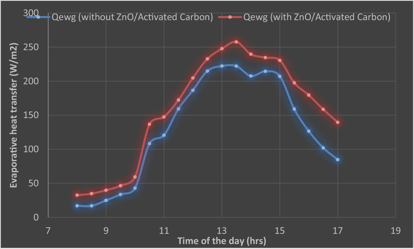 The energy transduced to water molecules accelerates evaporation, notably surpassing the rate observed in control stills lacking ZnO or activated carbon augmentation. Figure 10 quantitatively depicts the evaporative heat transfer coefficient for both the nanocomposite-integrated and control solar stills. The data unequivocally demonstrate a substantially elevated evaporative heat transfer throughout the operational daylight hours in the nanocomposite-enhanced still, Lawrence et al. (2022). The synergistic energy transfer mechanisms responsible for this notable improvement are direct solar absorption by the water molecules and additional energy flux from the integrated ZnO/activated carbon composite irrigating molecules within inclined, balanced wicking outside, which is mediated through the FR-ET phenomenon. Consequently, the presence of the ZnO/activated carbon nanocomposite augments the overall evaporative flux from the distillation unit.
