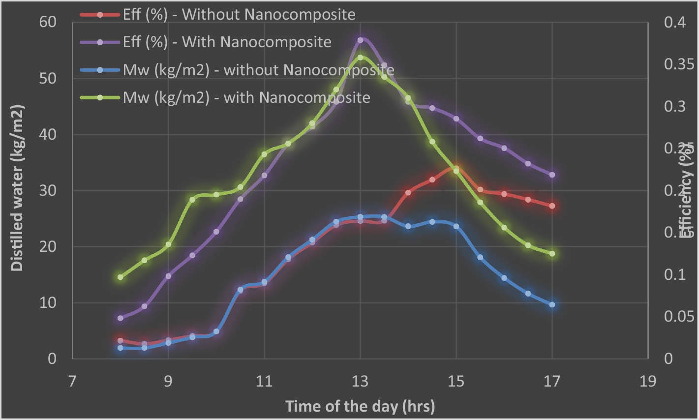 Figure 11 illustrates the superior performance metrics and operational advantages of the nanocomposite-augmented solar still, particularly its immediate concentrate production and enhanced conversion efficiency compared to a conventional control unit. Maximal instantaneous distillate flux was quantified at approximately 0.358 kg/m2 and 0.335 kg/m2 during the 30-min intervals peaking at 13:00 and 13:30 h, respectively. These values consistently surpassed the output of the control, still, underscoring the augmented system’s enhanced productivity. Over a complete 24-h operational cycle, the system achieved a total daily distillate yield of 5.123 L/m2. Notably, approximately 1 L of this output was generated during nocturnal hours, Essa et al. (2020). This nocturnal distillate production is directly attributable to the latent heat of fusion released during the exothermic phase transition of the integrated paraffin Phase Change Material (PCM). The ZnO/activated carbon solar still, specifically when incorporating paraffin wax, demonstrated an impressive average daily efficiency of 42.53%.