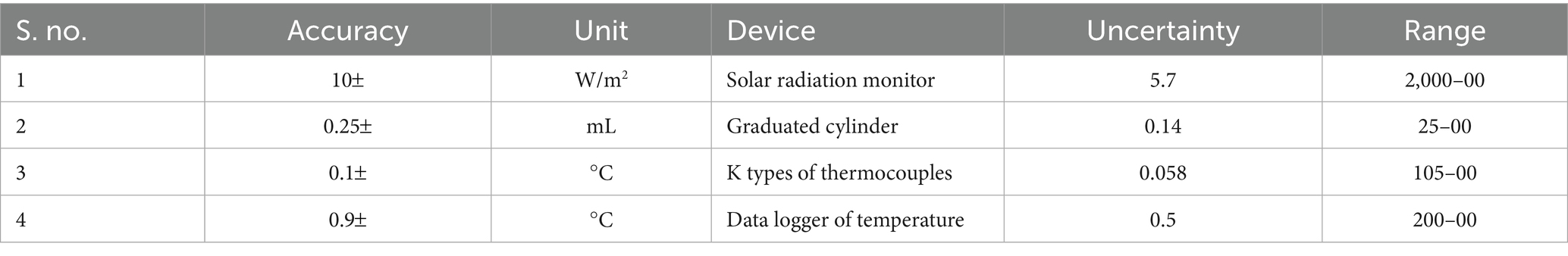 Table 1. The measurement capabilities, including accuracy, range, and uncertainty, of the instruments utilized in the wick-assisted solar distillation setup.