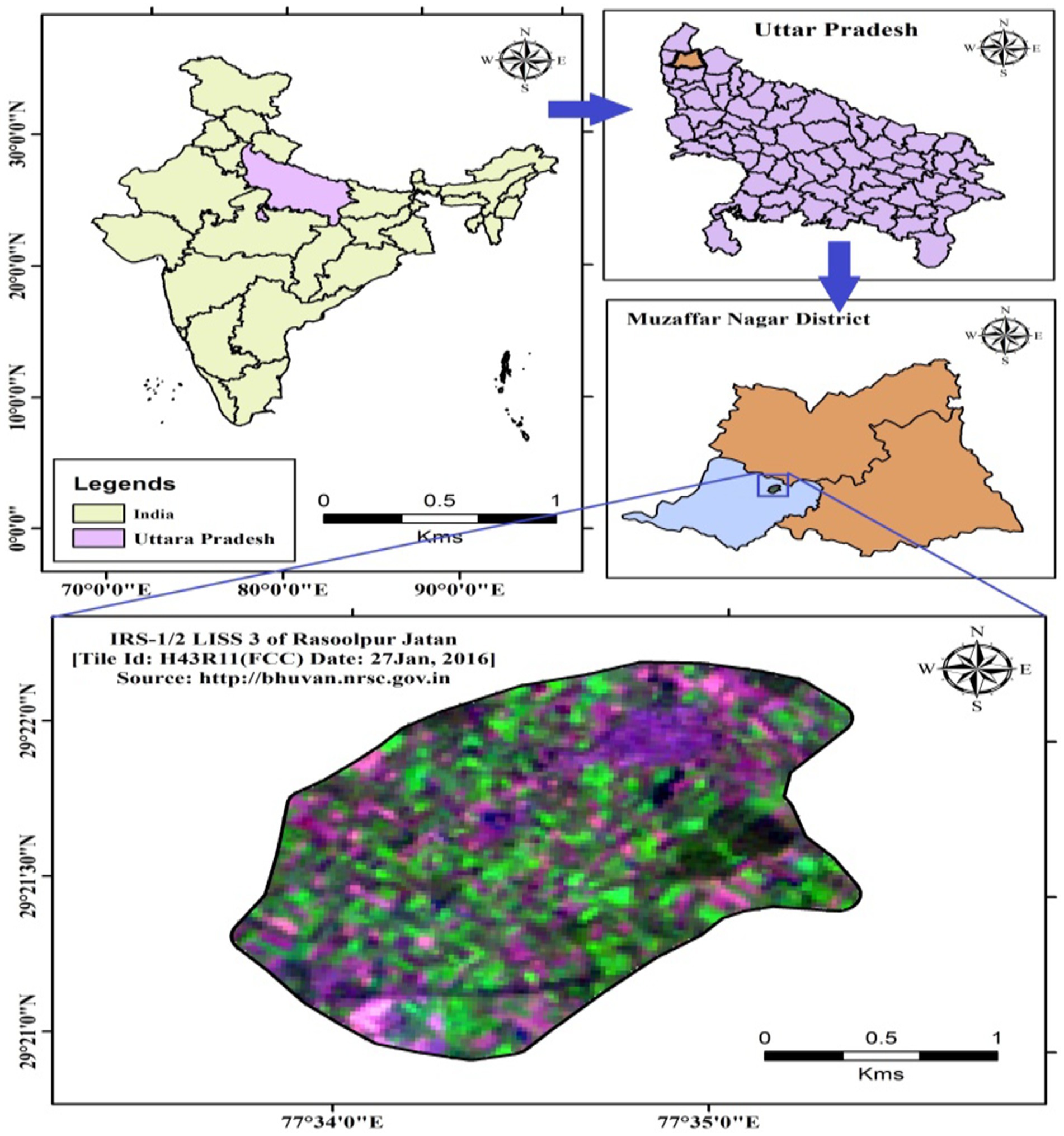 The study area, Rasoolpur Jatan in Muzaffarnagar district (Figure 1), is located between latitudes 29°20′N to 29°23′N and longitudes 77°33′E to 77°36′E. The elevation ranges from 237 to 245 meters above mean sea level1 (Figure 2). The meteorological data was obtained from the India Meteorological Department (IMD). This data was analysed and found that the region experiences a hot, dry sub-humid climate with an average annual rainfall of 873 mm, the majority of which occurs between July and October. During winter, the average minimum temperature varies from 7.3 °C to 13.5 °C, while the maximum temperature ranges from 18.5 °C to 28.6 °C. In the summer months, the minimum and maximum temperatures range from 13.5 °C to 24.6 °C and 30 °C to 41 °C, respectively. The highest temperatures are typically observed in June and the lowest in January. The area has an average annual relative humidity of 72%. The soils in the region are primarily medium-textured alluvial soils. Sugarcane is the dominant crop (Table 1), and irrigation is predominantly dependent on groundwater. However, the overexploitation of groundwater has led to a rapid decline in water levels. Piezometers were installed to monitor groundwater level data for the year 2012 and 2015. Different maps were developed using ArcGIS 10.2.2. The crop water requirements were estimated using the FAO CROPWAT 8.0 model. Aquifer modeling was conducted to evaluate groundwater recharge and fluctuations in water levels.