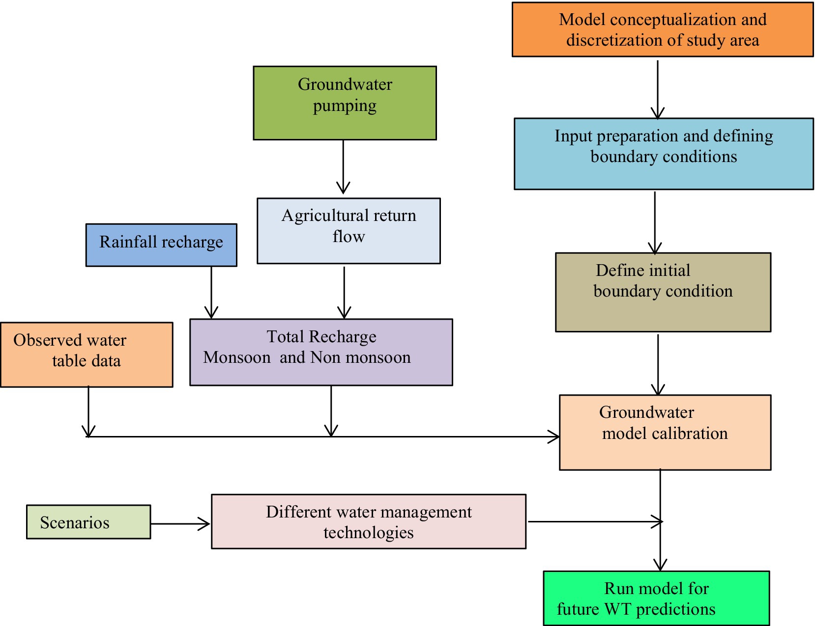 where Kxx, Kyy, Kzz are the hydraulic conductivities along x, y and z directions (LT−1), h is the total head (L), W is the volumetric flow of sources and sinks per unit volume (T−1), Ss stands for specific storage (L−1) and t stands for time (T). The sequence of activities and the modeling procedure are illustrated in Figure 3.
