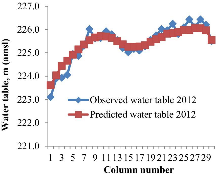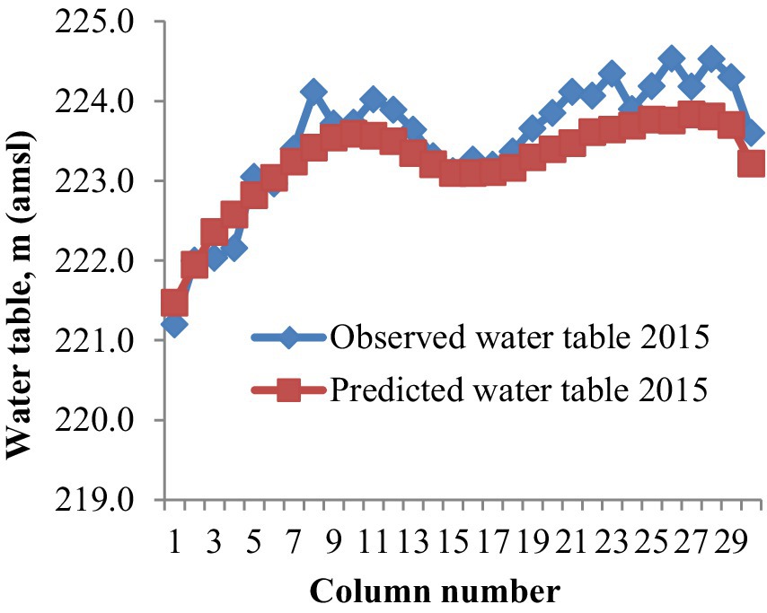 Four management scenarios were considered under the present study. Each of the scenarios had different levels of groundwater pumping and water saving is increasing. The five sizes of pumps used by farmers in the study area were 15 HP, 12.5 HP, 10 HP 7.5 HP and 5 HP, respectively. The 5 HP pumps are rarely used by the farmers due to deep water table. The discharge measured at farmers field through these pumps were 22.84, 17.92, 13.75 and 13.32 L/s; respectively. Taking into account of 220 tube wells at 16.95 L/s average discharge rate for 8 h per day and major area under sugarcane (213.3 ha), Rice (46.6 ha) and Wheat (80 ha) total annual groundwater pumping was 409 hectare-meter (ha-m). The total area of the village is 336 ha. Thus, per day groundwater draft was found to be 0.0033 meter/day (m/day). Rainfall infiltration method was used to estimate natural recharge during monsoon season in places where groundwater level monitoring is insufficient in space and time (GEC, 2009). In this study, rainfall factor for groundwater recharge during monsoon season for this area was taken as 22% of rainfall in each of the four monsoon months (CGWB, 2009) and return seepage from paddy, sugarcane and wheat fields were taken as 52%, 34%, and 23%, respectively, from applied irrigation (CGWB, 2009). Thus, recharge from rice, sugarcane and wheat field were taken as 0.0013, 0.0006 and 0.00013 m/day; respectively. The groundwater recharge from rainfall in each stress period were calculated as 0.0009, 0.00008 and 0.0005 m/day; respectively. Thus, total groundwater recharge (recharge from rainfall and return seepage from irrigation field) in each stress period were found to be 0.00293, 0.00211 and 0.00253 m/day; respectively. Net groundwater recharge in each stress period was calculated by subtracting total groundwater draft from total groundwater recharge. Thus, net groundwater recharge in each stress period were found to be −0.00037, −0.00119 and −0.00077 m/day; respectively. Negative sign indicates groundwater withdrawal was more as compared to groundwater recharge in all stress period. The same procedure was followed to calculate net groundwater recharge for rest of the scenarios. The net groundwater draft from agricultural areas was found to be 0.0033 m/day when water was applied through earthen field channel with 60% application efficiency and it was considered as reference scenario for rest of the scenarios. Groundwater saving, when 6% water was saved as seepage loss, laser land lever used and saved 17% water and when change the cropping pattern by replacing 50% sugarcane area with kharif maize are 24.54, 69.53 and 159.56 ha-m thus groundwater pumping reduced to 0.0031, 0.0028 and 0.00203 m/day, respectively. In Rasoolpur Jatan, water demand is expected to rise in the future due to the expansion of population and residential buildings. This may lead to further decline in water table.