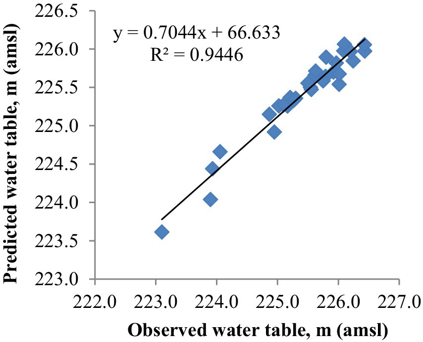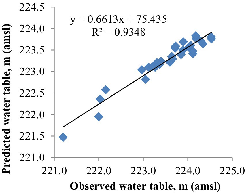 The transient calibration was performed by adjusting model parameters (hydraulic conductivity, specific yield) within permissible limits, as recommended by recent studies (Zhang et al., 2020; Kumar M. D et al., 2020a) by comparing simulated and observed post-monsoon groundwater levels for the year 2012. To assess the reliability of the calibrated model, validation was performed by manual method using observed and simulated post-monsoon water table data for the year 2015. The model’s performance and predictive accuracy were evaluated using statistical indicators such as Mean Square Error (MSE), Root Mean Square Error (RMSE), and the Coefficient of Determination (R2). These metrics were calculated using the following equations (Equations 2–4).