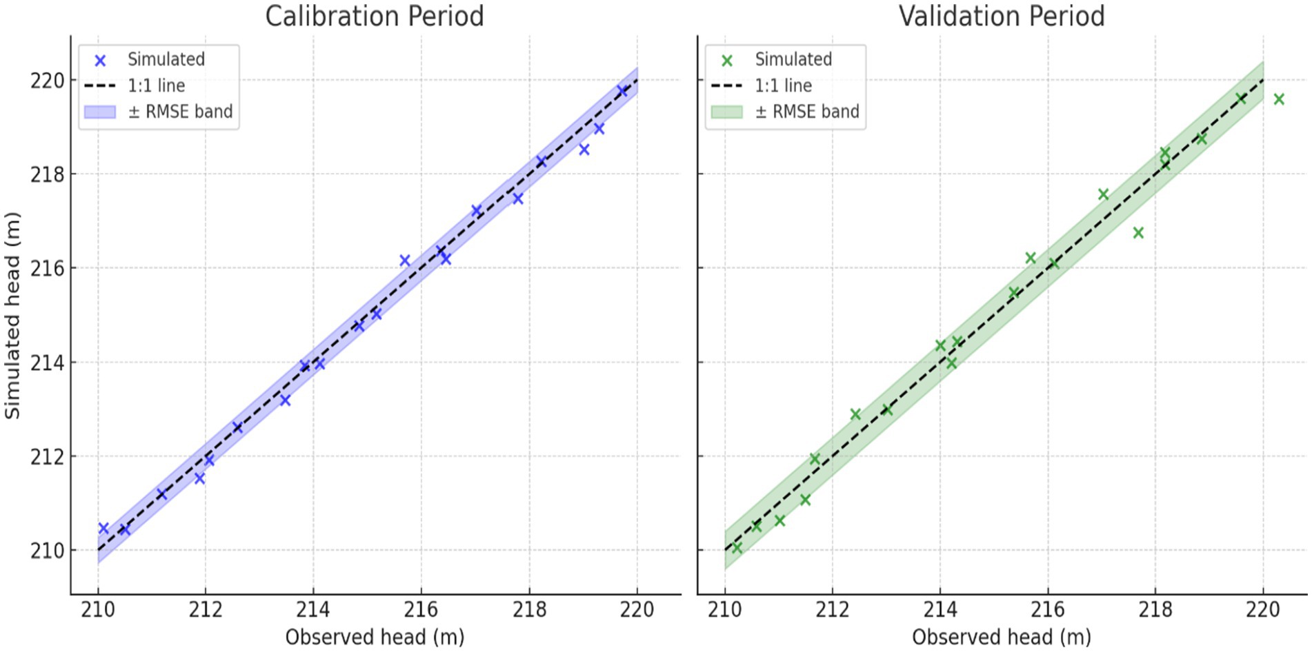 Despite strong performance, uncertainties remain inherent in groundwater modeling. Potential sources include measurement errors in field water levels, simplification of hydrogeological heterogeneity, and assumptions in boundary conditions. As illustrated in Figure 9, ±RMSE confidence bands show that while most simulated values fall within acceptable deviation from observations, a few outliers exist. These deviations may reflect localized heterogeneity in aquifer properties (hydraulic conductivity variations) not fully captured by the model. The sensitivity of the model to hydraulic conductivity (0.30 m/day) and specific yield (0.22) further indicates that deviations in these parameters could influence outcomes. Confidence in the modeling results is therefore high for regional-scale assessments but should be interpreted with caution for localized predictions. Future studies could employ Monte Carlo simulations or ensemble modeling to quantify parameter uncertainty more explicitly (Beven, 2006; Gupta et al., 2009).