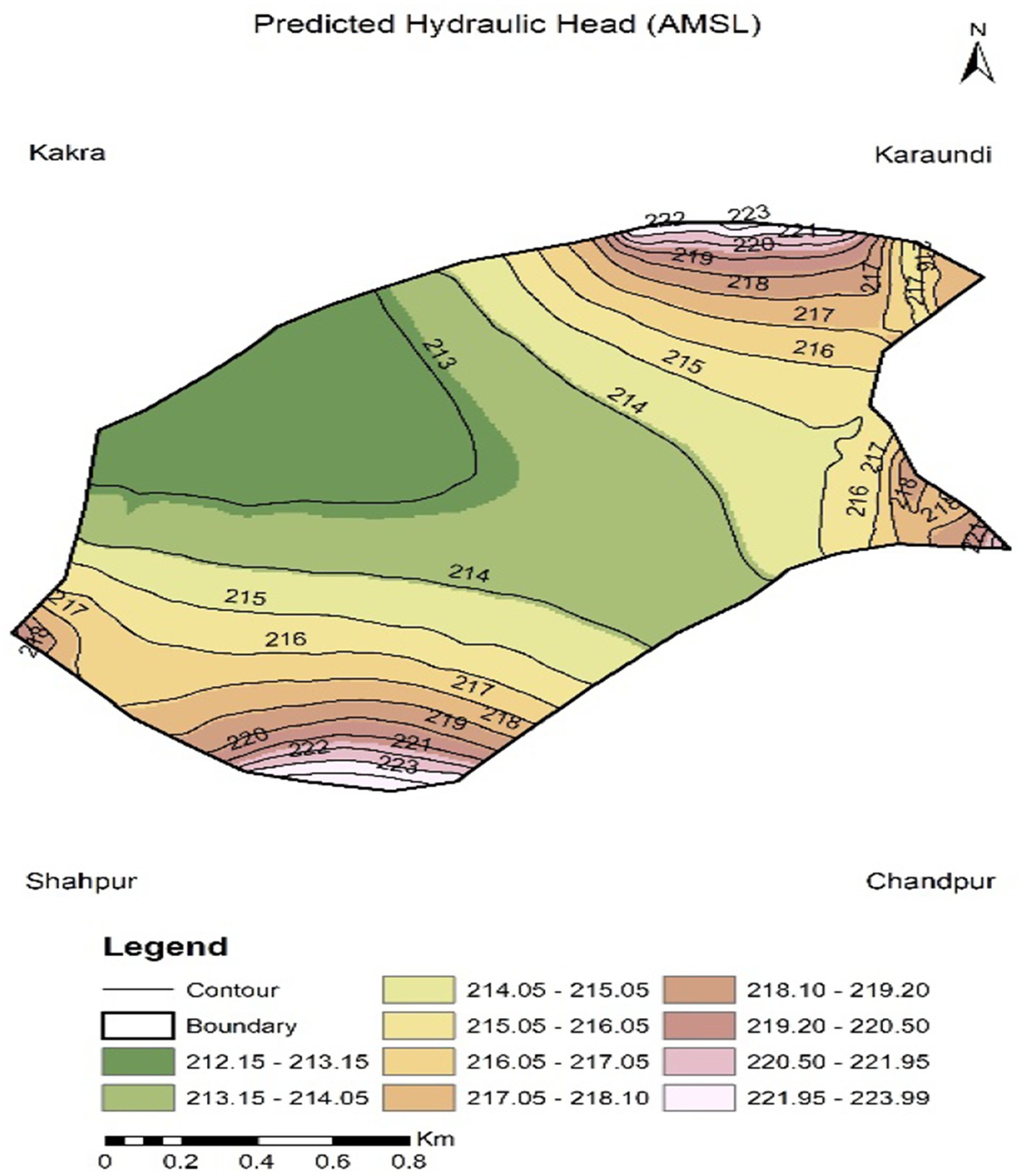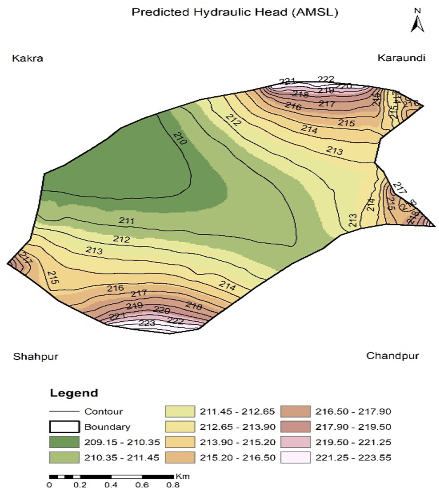 It is evident from the field that when irrigation is applied through earthen field channels with a measured application efficiency of 60% (Scenario 1) and groundwater draft of 0.0033 m/day the predicted water table elevation is 213.84 m. The corresponding water table contour map of scenario 1 is shown in Figure 14. This scenario is unable to offset the prevailing rate of groundwater extraction and thus fails to halt the declining water table. This finding is consistent with field evidence across India, where earthen field channels (EFCs) suffer from seepage, evaporation, and operational losses, resulting in application efficiencies between 50–65% (Dhawan, 2017; Kumar M. D. et al., 2020; Kumar R. et al., 2020). This implies that inefficient water conveyance significantly increases groundwater abstraction to meet crop water demands, thereby aggravating aquifer depletion.