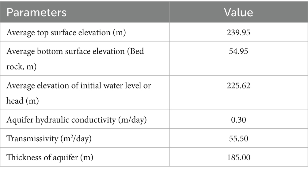 The observed hydraulic head data from May 2012 were used to define the initial conditions for the model (Table 2). Groundwater levels recorded during this period were used to create initial water table contours using the Kriging interpolation method within ArcGIS 10.2.2, which were then imported into MODFLOW. To account for subsurface inflow and outflow, selection of model boundary is important as it determines model accuracy and realism. For this flow boundaries were defined based on the selection criteria. Thus, the selection of model boundary in MODFLOW is the process of defining the limits of the model domain and specifying whether groundwater can flow in, flow out, or stay restricted at those edges. It is one of the most crucial steps in model setup, as it directly influences simulation reliability. The cells lying inside the boundary of the study area were taken as active cells whereas; cells lying outside the study area were taken as inactive cells. Hydraulic conductivity and specific yield values for the aquifers were derived from previous pumping test data from past work (CGWB, 2017). The specific yield within the study area was found to range between 0.16 and 0.22.