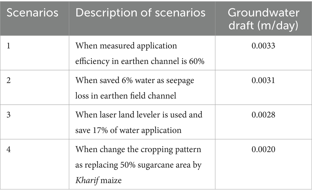 In Scenario 2, where improved management of earthen field channels led to a 6% water saving due to seepage loss reduction, the decline in the water table was reduced to 7.35 meters. Studies across India have consistently shown that minimizing seepage in earthen channels can lead to modest reductions in groundwater abstraction and improvements in local water availability (Shah, 2009; Singh et al., 2018a; Singh et al., 2018b; Kumar M. D. et al., 2020b; Kumar R. et al., 2020). However, despite this positive trend, the negative water table fluctuations observed under Scenario 2 indicates that the rise is insufficient to completely reverse groundwater decline. The continued depletion reflects the imbalance between recharge and abstraction, which has been widely reported in over-exploited regions of northwestern India (Rodell et al., 2009; CGWB, 2022). Even with seepage savings, demand from high water-consuming crops (sugarcane and paddy) drives extraction rates beyond the capacity of the aquifer to recover.
