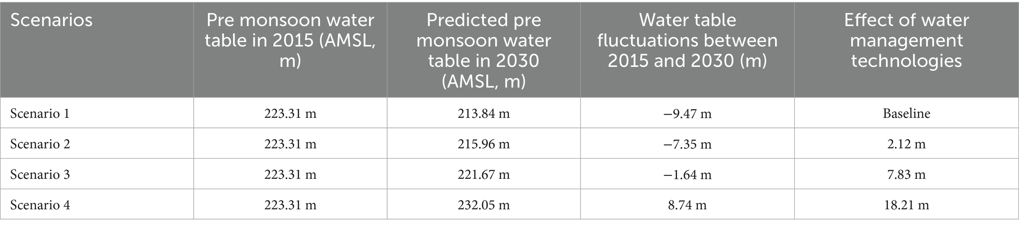 The results of Scenario 3 reveal that the application of Laser Land Leveling (LLL) significantly improves irrigation efficiency, leading to a projected rise in the pre-monsoon water table by 7.83 m, reaching water table elevation of 221.67 m compared to the baseline scenario (213.84 m). The corresponding water table contour map of scenario 3 is shown in Figure 16. The observed improvement is attributed to the ability of laser land leveling to ensure uniform water application across the field, reducing waterlogging, and tail-end losses (Jat et al., 2009). Empirical studies in the Indo-Gangetic Plains (IGP) demonstrate that laser land leveling reduces irrigation water application by 15–25%, while simultaneously improving crop yields by 7–10% (Naresh et al., 2014; Aryal et al., 2015; Kumar et al., 2017). Despite this substantial gain in groundwater status, the negative sign of water table fluctuations observed under Scenario 3 indicates that depletion persists, although at a reduced rate compared to Scenarios 1 and 2. This outcome highlights that technology-driven efficiency improvements, but not sufficient to fully balance groundwater abstraction and recharge in over-exploited aquifers. Similar findings were reported by Rodell et al. (2009) and CGWB (2022), where continued extraction for high-water-demand crops like rice and sugarcane outpaces natural recharge, even with water-saving interventions.