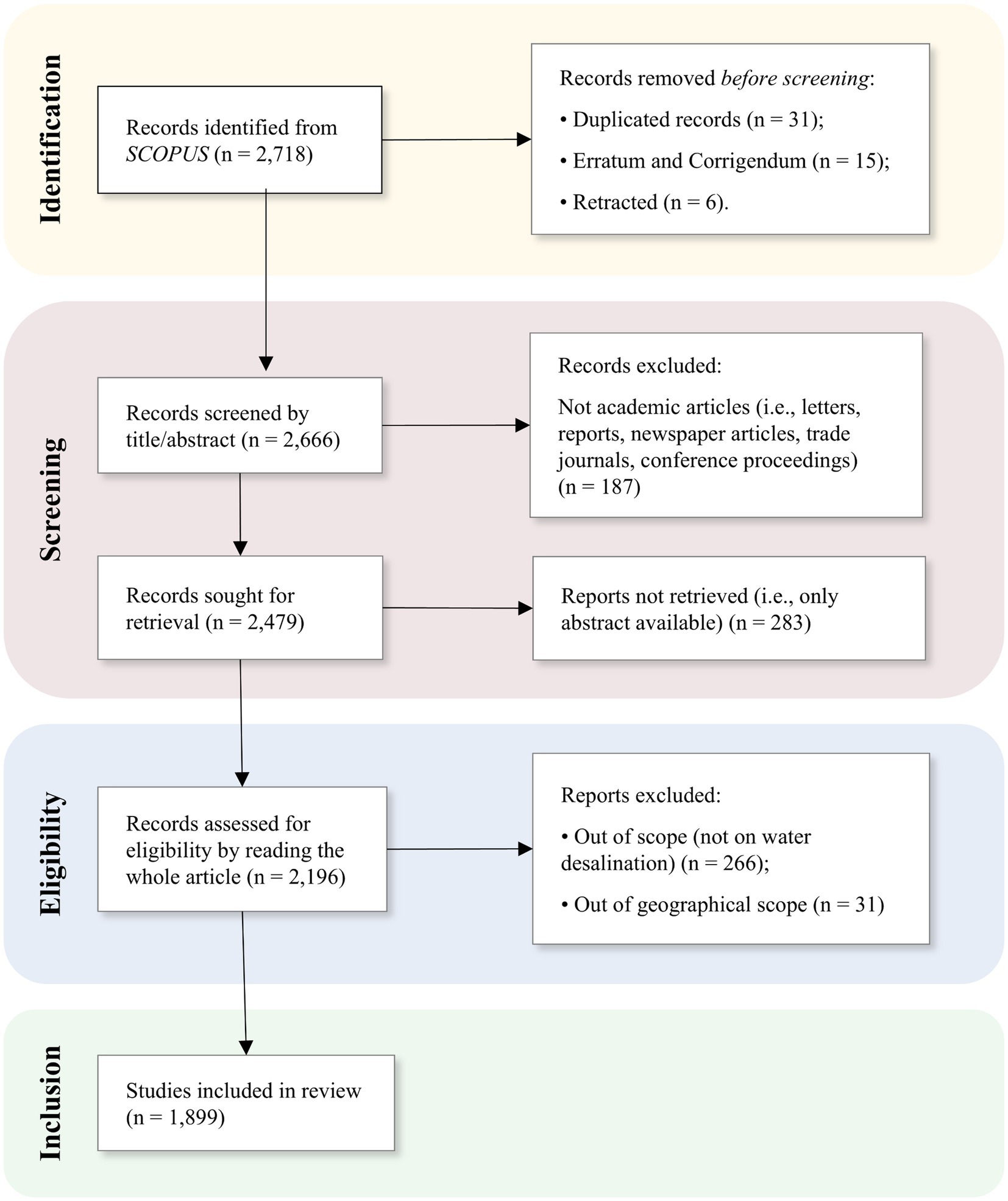 During the first stage of the PRISMA process (identification), 2,718 publications were retrieved from SCOPUS. After removing duplicates (n = 31), errata and corrigenda (n = 15), and retracted papers (n = 6), 2,666 publications remained. Screening proceeded in two steps. First, titles and abstracts were reviewed to exclude non-academic records (e.g., letters, reports, newspaper articles, trade journals, conference proceedings), reducing the dataset to 2,479. Next, all remaining publications were sought for full-text retrieval and 283 records were excluded because the full text was unavailable. During the eligibility phase, the 2,196 retrievable publications were read in full, and articles not focused on water desalination (n = 266) or outside the defined geographic scope (n = 31) were removed. This process yielded a final set of 1,899 publications for inclusion in the review.