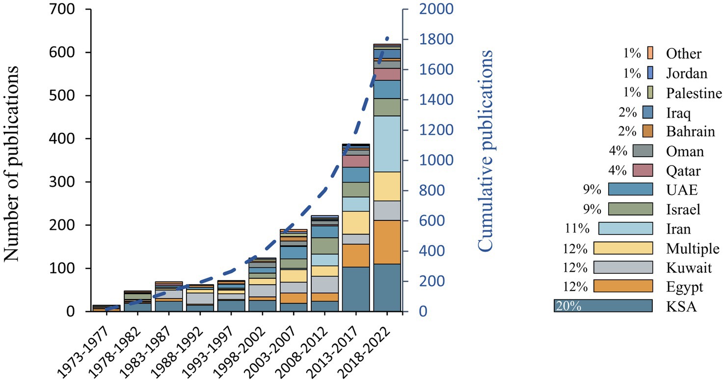 Figure 2. Historical trends in desalination research across the Middle East by ‘Studied Country’. Bars represent the number of publications over four-year intervals from 1973 to 2022, grouped by the ‘Studied Country’. The dashed line shows the cumulative number of articles over 50 years, while the legend (right) shows the cumulative percentage of publications by targeted country.