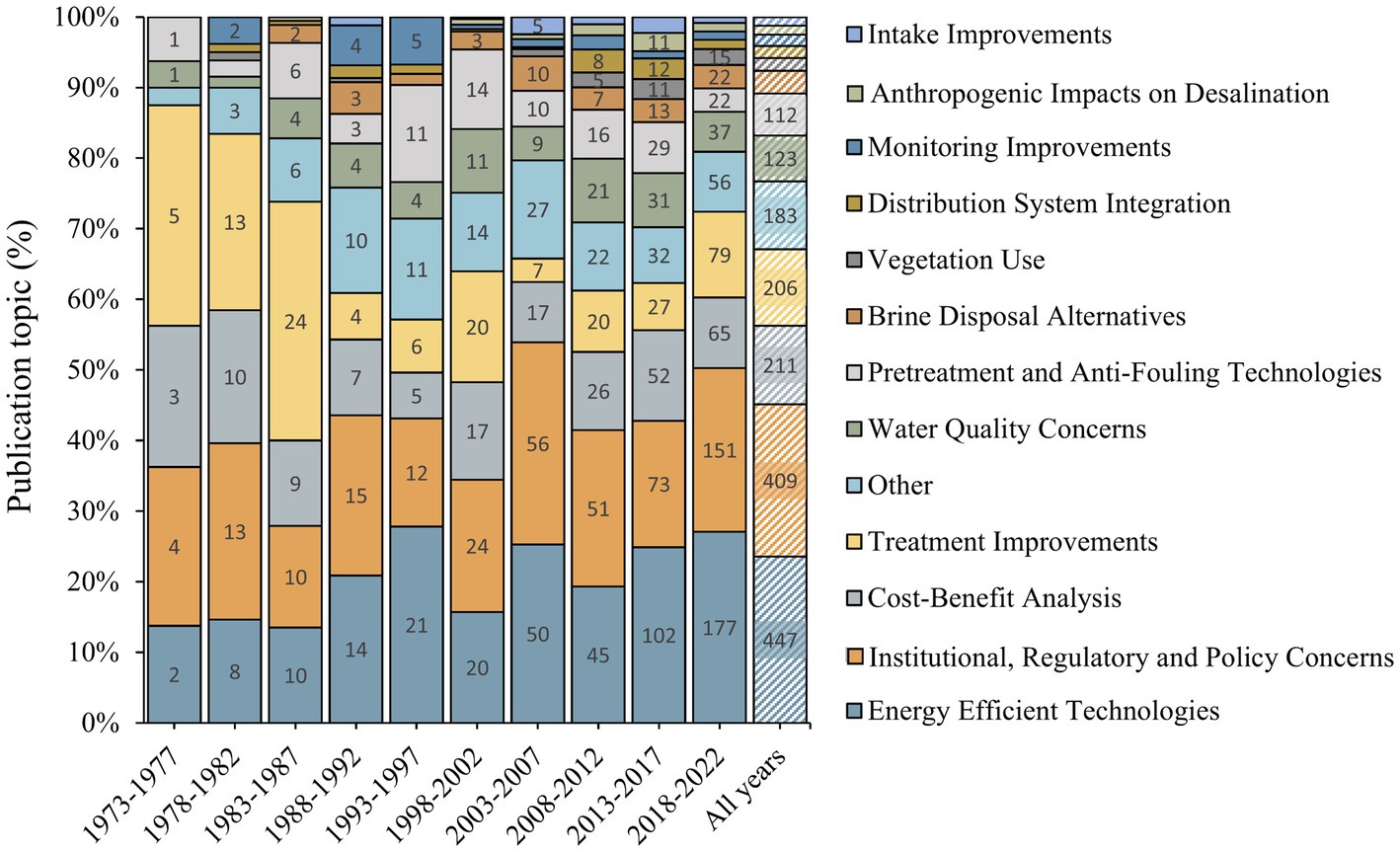 To identify historical trends across research topics, all publications were categorized into thirteen major thematic areas, as outlined in Table 1 and illustrated in Figure 3. Overall, publications classified as ‘Energy Efficiency Technologies’ and ‘Institutional, Regulatory and Policy Concerns’ were the most common thematic research areas in the Middle East, accounting for almost half of all publications historically produced across the region (24 and 22%, respectively). A further third of research was roughly evenly distributed among ‘Cost–Benefit Analysis’ (11%), ‘Treatment Improvements’ (11%), and ‘Other’ (10%), while ‘Water Quality Concerns’ and ‘Pretreatment and Anti-Fouling Technologies’ accounted for 7 and 6% of total publications, respectively. The remaining categories, ‘Brine disposal alternatives’, ‘Vegetation use’, ‘Distribution system integration, ‘Monitoring improvements’, ‘Anthropogenic effects on desalination’ and ‘Intake improvements’, collectively accounted for less than 11% of publications (Figure 3, ‘All Years’).