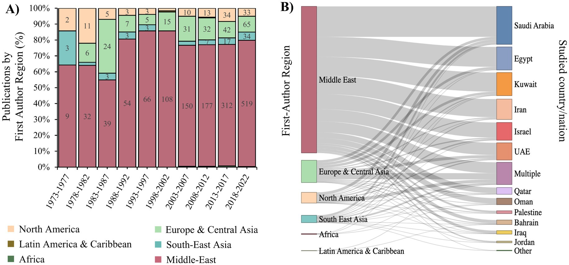 Figure 4. Authorship trends in desalination research in the Middle East. (A) Temporal trends in the proportion of publication of studies targeting the Middle East grouped by ‘First-Author Region’ (i.e., the region where the research institution hosting the lead researcher was located). (B) Left to right: flow of ‘First-Author Region’ to ‘Studied Country’ (i.e., the country target of the research).