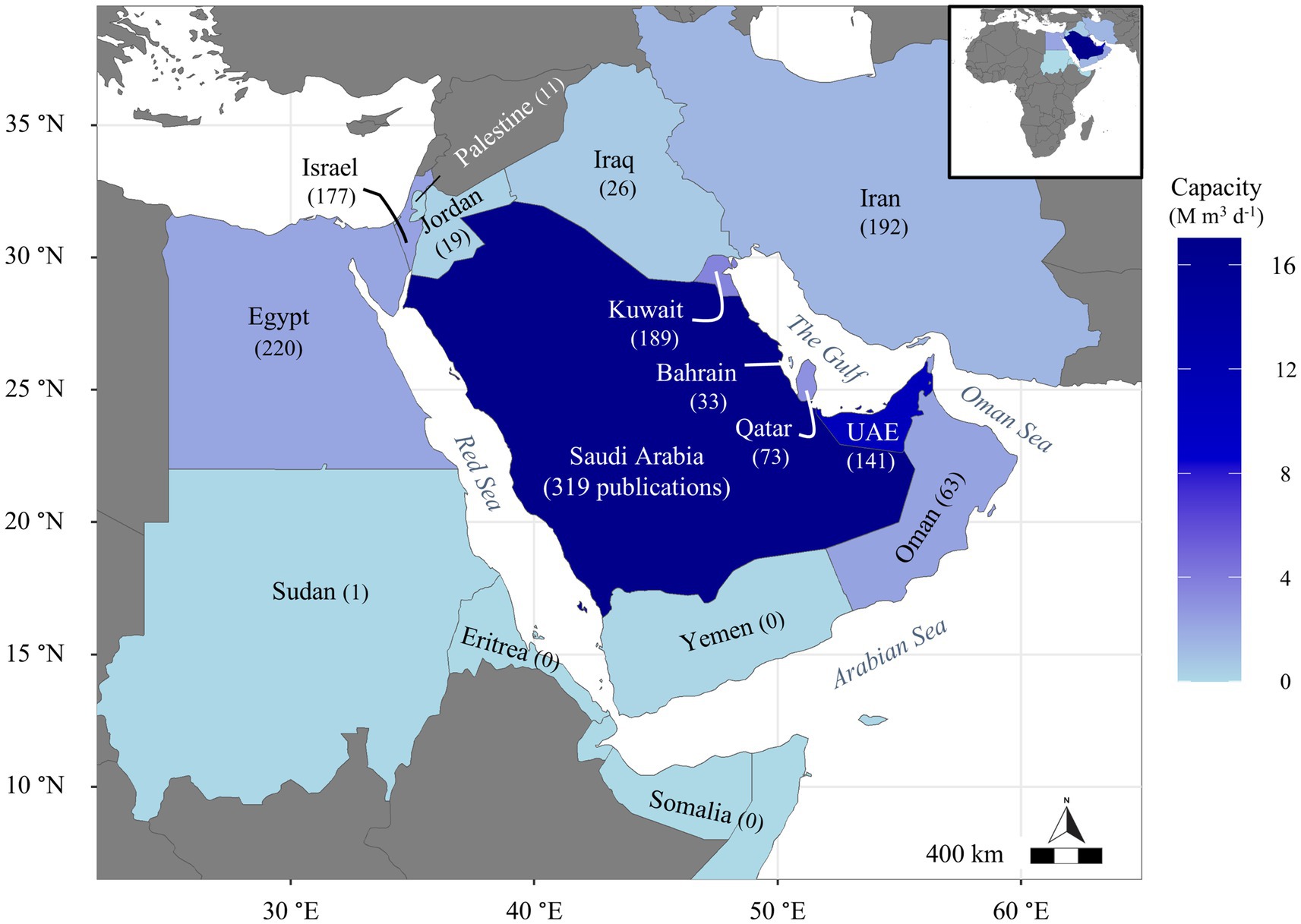 Figure 5. Research productivity and water desalination capacity in the Middle East. Color scale corresponds to desalinated water production capacity (million m3 d-1) in 2022. Bracketed numbers adjacent to country names represent the cumulative number of publications (as of December 2022) on water desalination research per country (classified by ‘First-Author Institution’, i.e., the physical location of the institution hosting the lead researcher and, thus, representing the country hosting the research project). (Many borders in this region are contested, which the authors acknowledge. As such, this map does not reflect current geopolitical complexities nor the views of the authors but is based on borders delineated by the R package ‘rnaturalearthdata’).