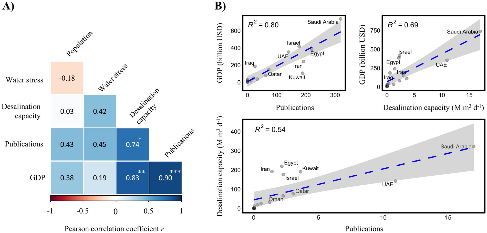 Figure 6. Correlation analysis and scatterplots of population, desalination capacity, number of publications, GDP and water stress. (A) Correlation matrix assessing associations between population, desalination capacity, number of publications, GDP and water stress. Numbers indicate the r value. Asterisk indicates statistical significance level with *p < 0.01, **p < 0.001, and ***p < 0.0001. (B) The three scatterplots display the relationship between publications and GDP (top left panel), desalination capacity and GDP (top right), and publications and desalination capacity (bottom). Each point represents a country, labeled for clarity, with regression lines (blue dashed) showing the linear trend, shaded by the 95% confidence intervals. The R2 values quantify the proportion of variance explained by the regression model, indicating the strength of the relationships.