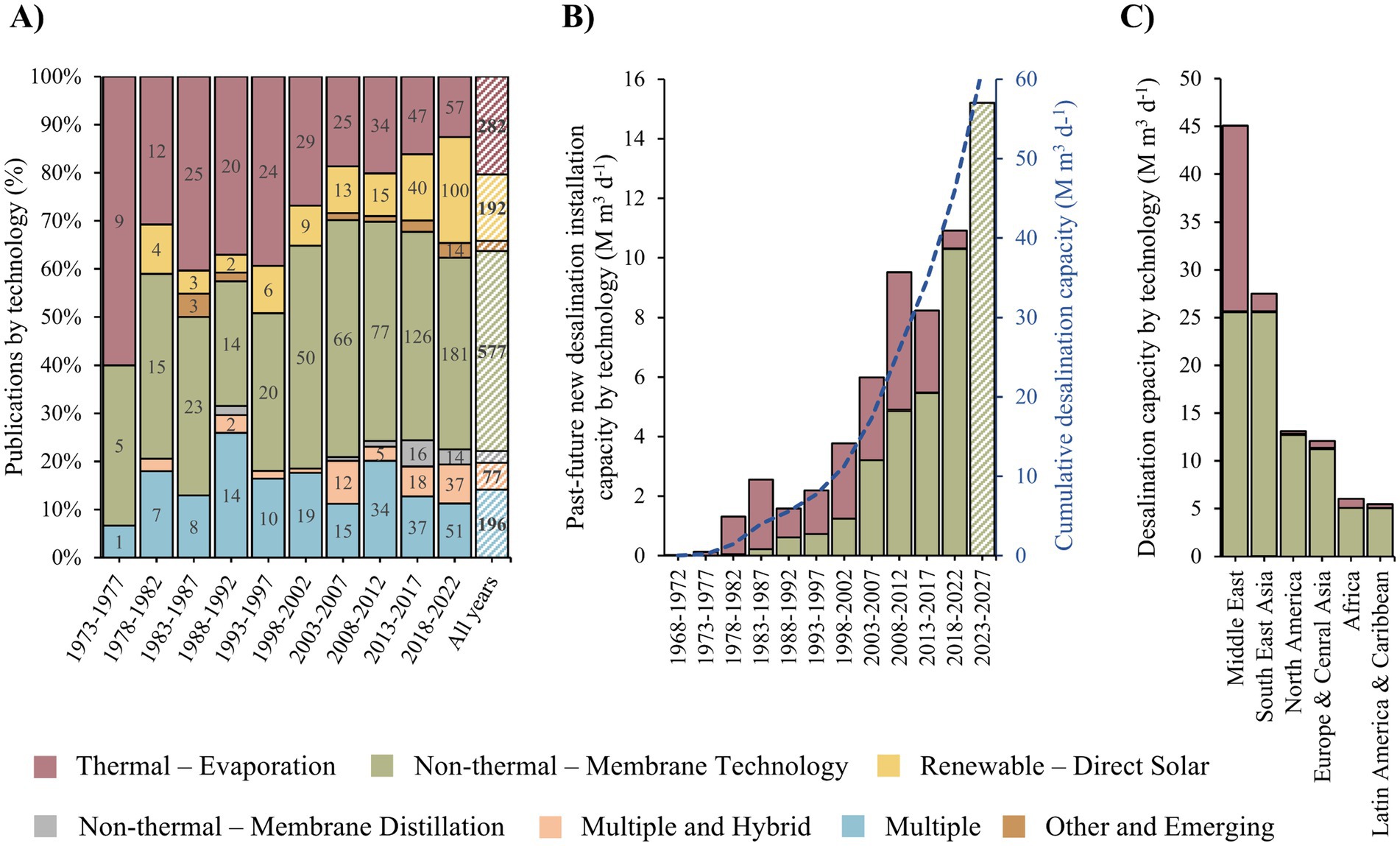 Figure 7. Comparisons between scientific research (publications) and water production (desalination capacity) by technology. (A) Changes in percentage of publications by desalination technology over time; (B) trends in past and future newly installed desalination capacity by technology over time; (C) comparison between current (i.e., 2022) desalination capacity by technologies between the Middle East and other geographic regions. In (A) 502 papers (i.e., 26.4% of the total) were excluded from the analysis as they either did not specify a technology or were off-topic (i.e., related to desalination but not specifically focused on desalination technologies).