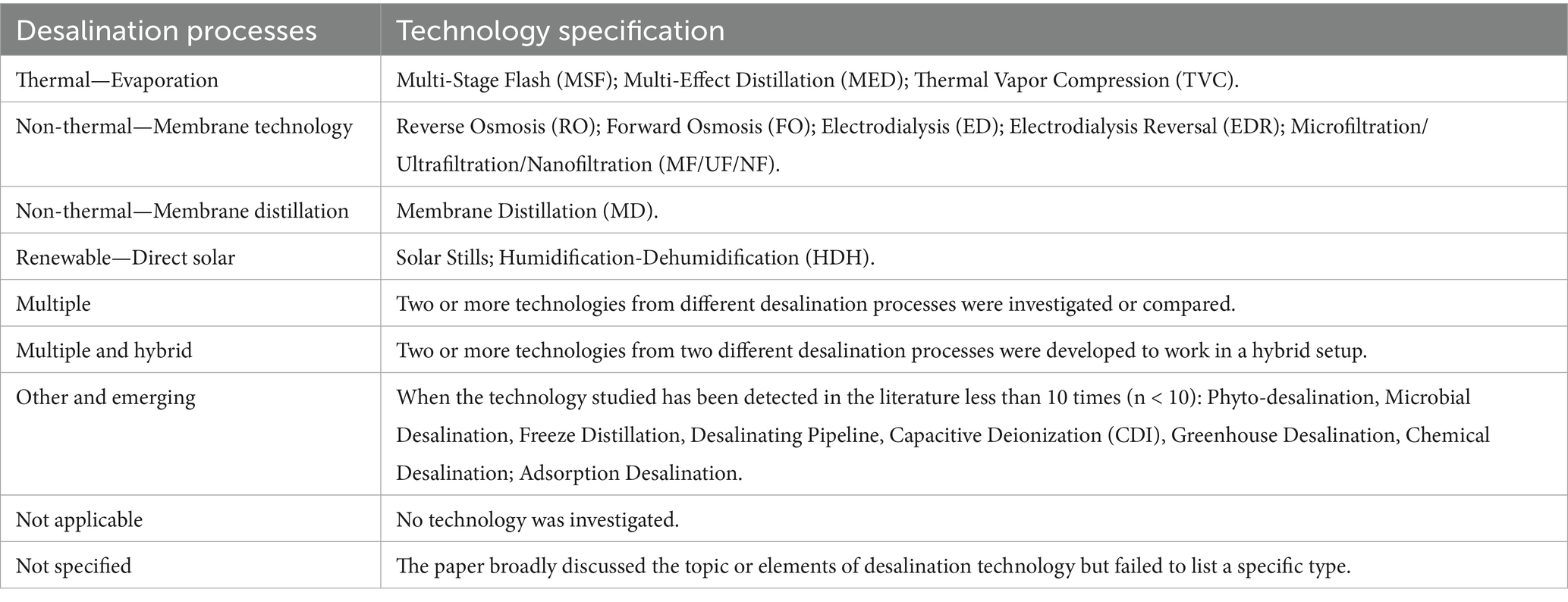 To explore geographic and temporal trends in research, the reviewed articles, books and book chapters were categorized using scientometric analysis to allow for comparisons across the dataset. Publications were first classified by location: ‘Studied Country’ (including ‘Multiple’ for multi-national research), indicating the focal country of the desalination research; and ‘First-Author Institution’ and ‘First-Author Region’, which reflected the physical location of the lead researcher at the time of publication, thereby identifying the country or region hosting the research project. Publications were further classified by ‘Research Theme’ (Table 1 and Supplementary Table S3 ‘Research Theme details’) and ‘Desalination Technology’ (Table 2), in order to highlight the evolution of research topics and desalination technologies over time. While other reviews have broadly classified desalination research themes using automated categories from SCOPUS and Web of Science (e.g., ‘environmental science’, engineering’, ‘chemistry’, etc.) or keywords (e.g., ‘membranes’, ‘seawater’, ‘water filtration’, etc.) (Zapata-Sierra et al., 2021; Chowdhury et al., 2024), our review provides a more in-depth and precise analysis by applying an adapted version of the US Bureau of Reclamation (2014) thematic framework for desalination research priorities (Supplementary Table S3). Because only one publication was recorded before 1973 (Shelef et al., 1972), this single record was excluded from the analysis.