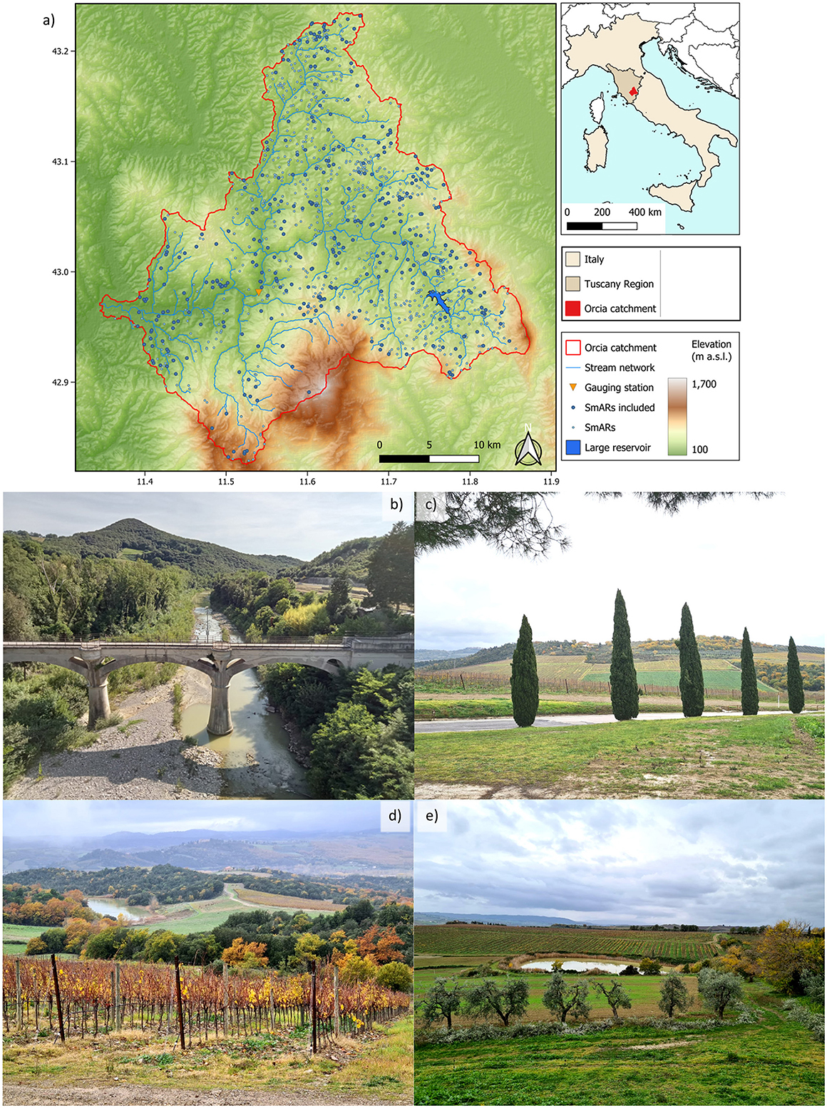 Figure 1. The study area. (a) The Orcia catchment in Italy and Tuscany and the map with the gauging station, the channel network, the planned large dam and the SmARs; (b) the Orcia River at the Monte Amiata Scalo gauging station; (c) typical and characteristic landscape of Val d'Orcia; (d, e) SmARs examples with olive groves and vineyards. Pictures were taken within the AG-WaMED Living Lab activities.