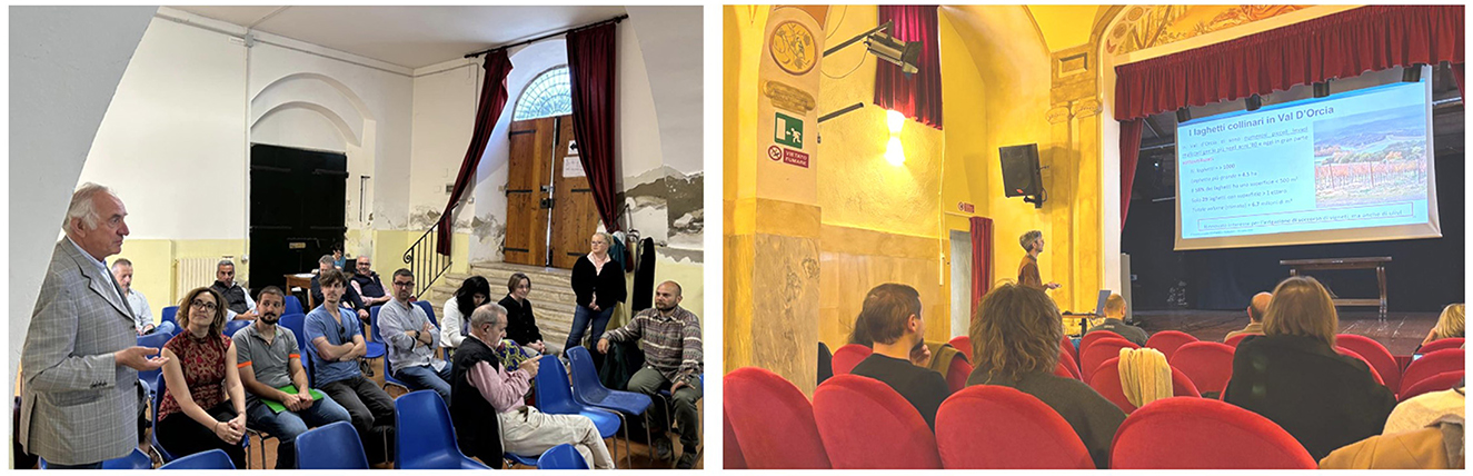 In the first participatory workshop, the main water-related challenges and potential solutions were discussed through the World Cafè participatory methodology (Table 1, Figure 2) guided by the RRI Roadmap©™ methodology. Most of the debate revolved around the underutilized SmARs and the planned large dam of San Piero in Campo, which were considered the main solutions to cope with the enhanced water demand caused by climate change. Other technical and non-technical factors associated with the development and management of SmARs and the large dam emerged from the initial brainstorming with stakeholders and these included: lack of coordination among actors involved in water management, legislative and economic barriers for the requalification of existing SmARs and the importance of adopting soil water conservation and infiltration measures to reduce irrigation requirements at the farm and catchment scales (Forzini et al., 2024).