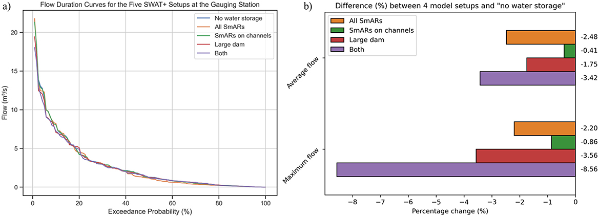 Figure 4. (a) Flow duration curves of the five SWAT+ setups, plotted considering the monthly time series, at the gauging station. (b) The percentage differences in average and maximum flows at the catchment outlet between the four model setups with reservoirs simulated and the “No water storage” setup.