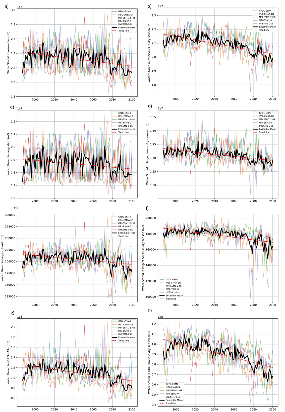 Figure 5. Line plots of yearly (left) and dry season (right) water stored in reservoirs for the five GCMs and the ensemble mean, with the trend line for all reservoirs, large dam, the largest SmAR, and IQR SmARs. (a) Water stored in reservoirs (m3) – Ensemble Mean and Trend Line, (b) Water stored in reservoirs in dry season (m3) – Ensemble Mean and Trend Line, (c) Water stored in large dam (m3) – Ensemble Mean and Trend Line, (d) Water stored in large dam in dry season (m3) – Ensemble Mean and Trend Line, (e) Water stored in largest SmAR (m3) – Ensemble Mean and Trend Line, (f) Water stored in largest SmAR in dry season (m3) – Ensemble Mean and Trend Line, (g) Water stored in IQR SmARs (m3) – Ensemble Mean and Trend Line, (h) Water stored in IQR SmARs in dry season (m3) – Ensemble Mean and Trend Line.