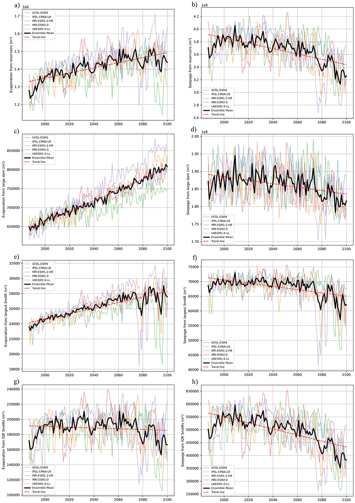 Figure 6. Line plots of yearly evaporation (left) and seapage (right) from all reservoirs, large dam, the largest SmAR and IQR SmARs for the five GCMs and the ensemble mean, with the trend lines. (a) Evaporation from reservoirs (m3) – Ensemble Mean and Trend Line, (b) Seapage from reservoirs (m3) – Ensemble Mean and Trend Line, (c) Evaporation from large dam (m3) – Ensemble Mean and Trend Line, (d) Seapage from large dam (m3) – Ensemble Mean and Trend Line, (e) Evaporation from largest SmAR (m3) – Ensemble Mean and Trend Line, (f) Seapage from largest SmAR (m3) – Ensemble Mean and Trend Line, (g) Evaporation from IQR SmARs (m3) – Ensemble Mean and Trend Line, (h) Seapage from IQR SmARs (m3) – Ensemble Mean and Trend Line.