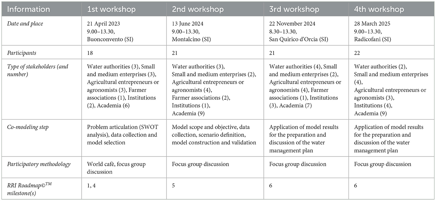 The study is conducted within the framework of the PRIMA-funded AG-WaMED Project.2 AG-WaMED aims to provide innovative, evidence-based participatory management solutions to water scarcity governance that can be scaled at the Mediterranean level. The Orcia catchment is one of the four rural Living Labs (LLs; Ceseracciu et al., 2023) of the project and has been recently recognized as a water-oriented LL by the Water4All partnership.3 These LLs are animated through the Responsible Research and Innovation (RRI) Roadmap©™, an innovative methodology for transdisciplinary research projects aiming at addressing socio-environmental challenges through co-creation processes involving scientists and practitioners (Theodotou Schneider, 2019). The RRI Roadmap©™ comprises eight milestones4 and steps for identifying common issues, motivating change and transition, co-designing solutions and co-constructing actions (Supplementary Table S1). The RRI Roadmap©™ integrates principles of Design Thinking and Change Management together with the dimensions of Responsible Research and Innovation (RRI) to foster inclusive stakeholder engagement, iterative co-creation, and reflective practice throughout the research and innovation processes. By structuring the co-modeling activities around these principles, the approach ensured that diverse local stakeholders were actively involved in building trust among them, identifying challenges, envisioning sustainable scenarios, and collaboratively co-designing viable solutions. Practitioners in Val d'Orcia LL include farmers, agronomists, small and medium enterprises, representatives of institutions and water management authorities and were engaged through four stakeholders' workshops, site visits and interviews (Table 1). While all milestones are equally important for enabling the co-creation of solutions in the AG-WaMED LLs, two steps are particularly critical for the co-modeling process presented in this study, namely 5. co-design and 6. co-construct. Co-design is the phase in which modeling scope, objectives, and scenarios to be simulated are aligned and refined collaboratively between the AG-WaMED partners and the involved actors. This milestone was the key focus of the first and second participatory workshops, where most of the time was dedicated to discussing the scope of the co-modeling and to defining modeling choices. More specifically, in the first workshop we mainly used the World Cafè participatory methodology, while for the other workshops we used focus-group discussion (Löhr et al., 2020). Co-creation, in the context of the RRI, is the process of creating public policies and services with and for the people (Theodotou Schneider, 2019). In the AG-WaMED Project this step resulted in the development of a shared water management plan (AG-WaMED Project, 2025) that capitalizes on the multidisciplinary analysis carried out during the project, including the hydrological co-modeling in SWAT+, and sets a series of measures to be incrementally implemented to address water scarcity in the Val d'Orcia LL. The third and fourth participatory workshops primarily focused on discussing the draft of the plan, its objectives, proposed measures and strategies for implementation.