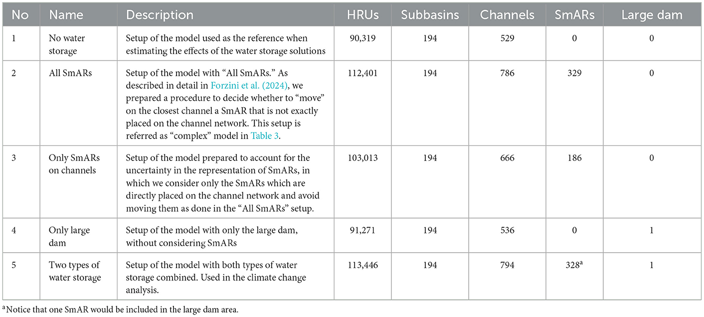 To carry out the analyses, after calibration and validation, we prepare five alternative complex setups of the SWAT+ model (Table 2). Setup 1 is implemented without any water storage and is used as the baseline for comparison instead of the setup used in the calibration phase that has a very reduced number of HRUs. We then differentiate two setups for considering the SmARs: in Setup 2 we include all of them following the approach explained in detail in Forzini et al. (2024), while in Setup 3, to account for the uncertainty in the representation, we include only the SmARs on the channel network. In addition, we simulate the planned large dam of San Piero in Campo, both alone (Setup 4) and in combination with the SmARs (Setup 5).