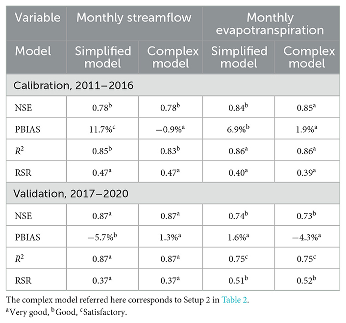 Table 3. The statistics of the SWAT+ model for monthly streamflow and actual evapotranspiration during calibration and validation periods for the simplified and complex models.