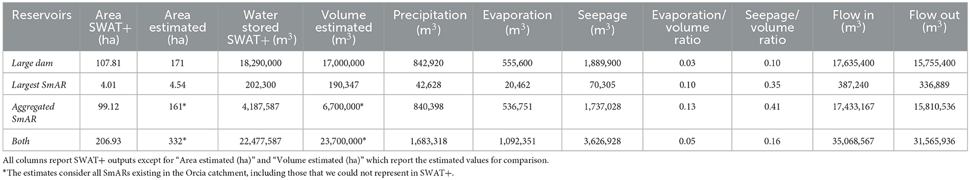 Table 4. Yearly average characteristics considering the baseline simulation (2011–2020) of the large dam, the largest SmAR, the aggregated SmARs and both types of water storage combined considering the outputs of the “Two types of water storage” SWAT+ setup.