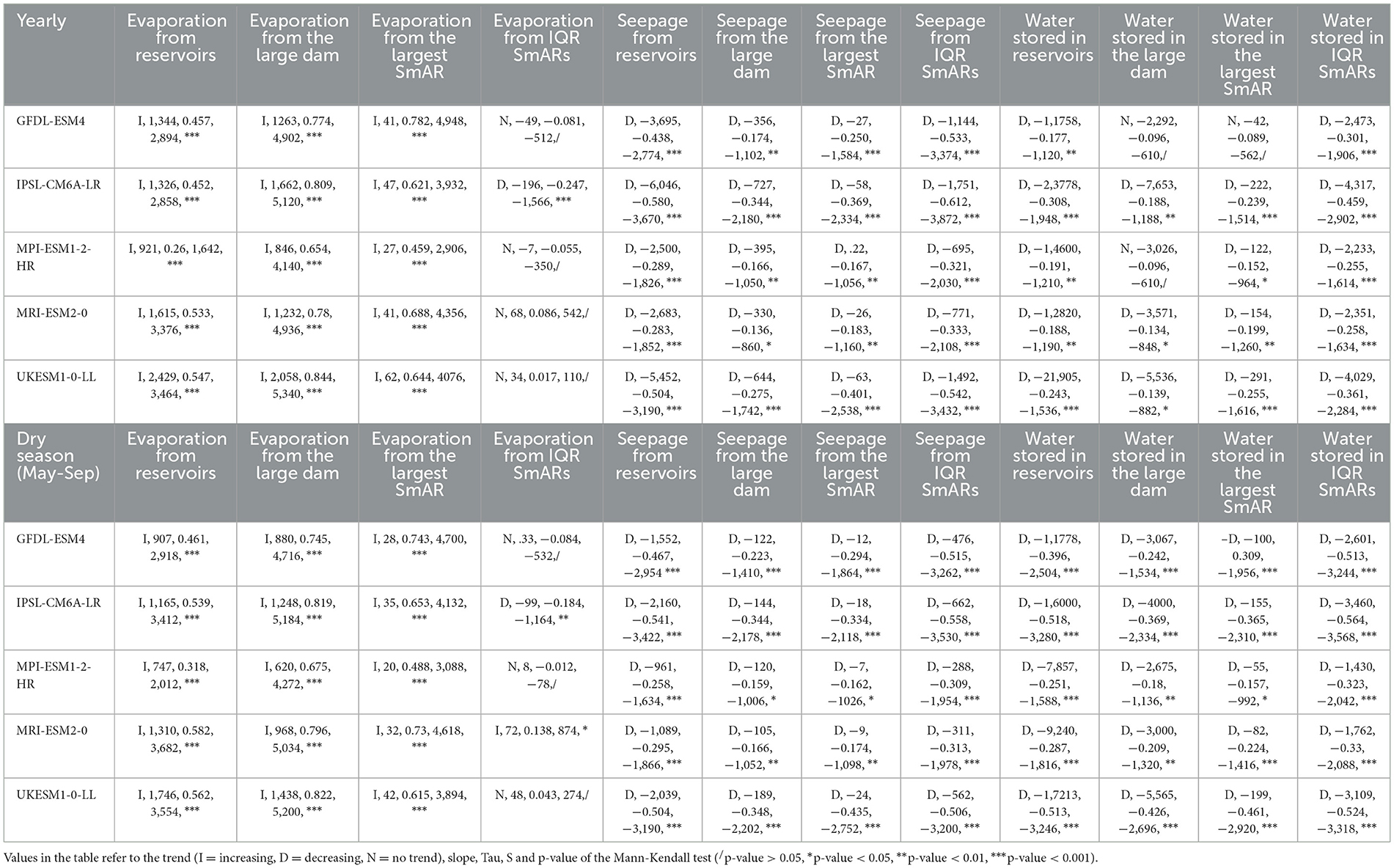 Table 5. Trend of yearly and dry season (from May to September) average temperature, precipitation, evaporation from reservoirs, seepage from reservoirs, and water stored in reservoirs.