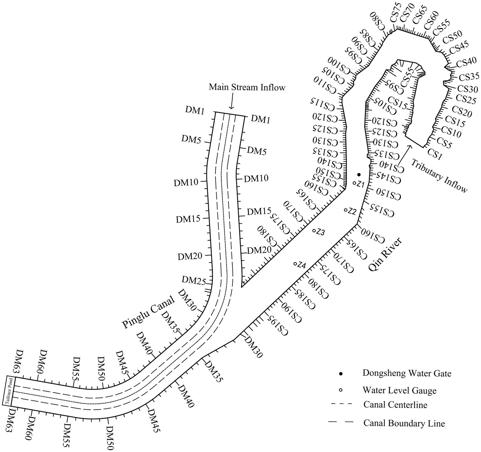 The Qinjiang River joins the Pinglu Canal at Luwu Town with a confluence angle of about 20°. The confluence point is approximately 6.6 km upstream of the Qishi Hub and 49.7 km downstream of the Qingnian Hub. The mainstream of Qinjiang River is 195 km long with an average gradient of 0.32‰. The drainage basin encompasses a total area of 2,391 km2, characterized by a rainfall catchment area of 2,230.8 km2. Within this hydrological system, 12 tributaries have individual catchment areas exceeding 50 km2. Among these, four major tributaries—Nalong Stream, Jiuzhou River, Taiping Stream, and Xinping Stream—exhibit catchment areas that each surpass 100 km2. The Qinjiang River demonstrates a mean annual discharge of 64.37 m3/s, corresponding to a long-term average annual runoff volume of 2.03 billion cubic meters. The basin exhibits an annual runoff depth of 900 mm, with the maximum annual precipitation recorded at 1,683 mm, as determined by multi-decadal hydrological observations. At the river mouth of the Qinjiang River tributary, the water depth is 0.45 m, and the river surface width is 75 m. During the flood season, the near - shore flow velocity is 0.03 m/s, and the average sediment concentration is 0.915 g/L. The median grain size of the bed sediment is 0.18 mm on average, and that of the shore sediment is 0.165 mm on average. In the dry season, the average river width is about 60 m, and the water depth is about 2 m. The river bed slope is about 0.4 per thousand. The main channel flow velocity is 0.202 m/s, and the near - shore flow velocity is 0.029 m/s. The water body’s sediment concentration is 0.45 g/L. The particle size of the bed sediment ranges from 0.3 μm to 700 μm, and that of the shore sediment ranges from 0.3 μm to 500 μm. The total annual sand transport of the Qinjiang River tributaries in a typical year is as follows: 335,200 tons during years of abundant water, 385,900 tons in years of flat water, and 308,100 tons in years of dry water. The annual bed load sediment transport volumes are 10,100 tons in flood years, 11,600 tons in years of level water, and 920,000 tons in years of dry water.