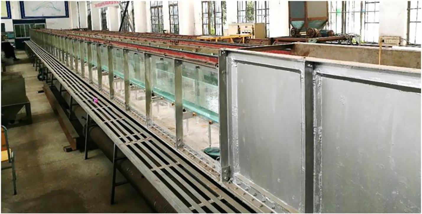 The experimental flume system measured 28 m in length, 0.56 m in width, and 0.7 m in height, comprising three vertically arranged components from base to apex. The basal section was equipped with height-adjustable bearing supports incorporating rotary gear mechanisms. The intermediate section contained the primary steel frame structure that simultaneously provided rigid support for the upper glass flume assembly and interfaced with the underlying bearing system to enable precise slope adjustment. The uppermost section consisted of a modular glass flume fabricated from transparent panels measuring 3.3 m × 0.552 m × 0.008 m (length × width × thickness), with these standardized glass modules constituting both the sidewalls and basal plane of the hydraulic conveyance structure. The flume inlet is equipped with a three-stage flow-conditioning grid for flow regime adjustment. The tailgate system comprises two configurations: a hinged type and a sluice gate type, enabling coarse and fine flow regulation, respectively. The installation error of the flume glass panels is maintained within ±0.2 mm, with a total flume length tolerance of ±0.5 mm and structural deformation limited to ±0.3 mm. Field photographs of the 28-meter flume are presented in Figure 3. The flume is equipped with dual water supply-return systems. The small pump delivers a flow rate range of 0–45 L/s, while the large pump provides 0–85 L/s, both featuring adjustable inlet valves for flow regulation.