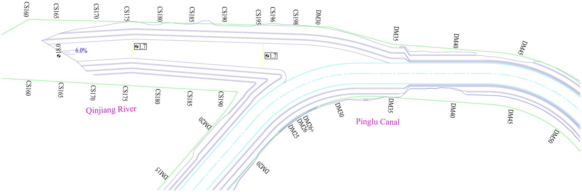 The canal alignment along the mainstem of Qinjiang River essentially follows the thalweg of the watercourse, extending over a total length of 48.5 km. Through engineered interventions such as channel widening, meander cutoff rectification, and strategic dredging, the waterway has been hydrotechnically configured to meet the prescribed navigation channel dimensions of 80 m (channel bed width) × 6.7 m (design water depth) × 360 m (minimum curvature radius), thereby complying with inland waterway classification standards. The canal has a bottom elevation of 1.7 m and a bottom width of 80 m, with side slopes at a ratio of 1:2. According to the terrain on both banks, berms of different elevations are set up, with their width fixed at 3 m. Empirical thresholds derived from prior hydraulic investigations prescribe that lateral flow velocities should be constrained to ≤0.3 m/s, longitudinal velocities to ≤2.5 m/s, and maximum hydraulic gradients to ≤2.0‰ in canal confluence zones.