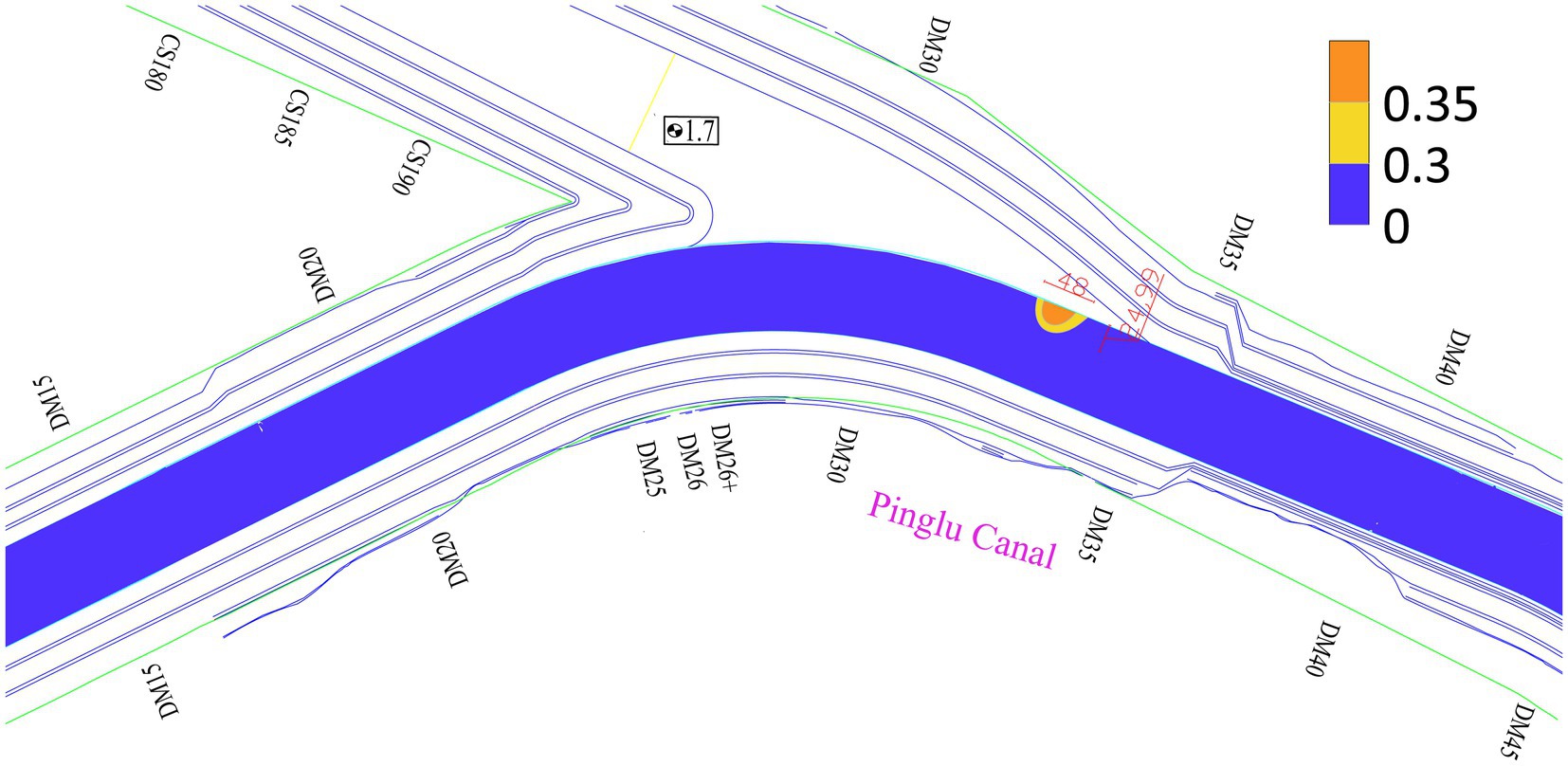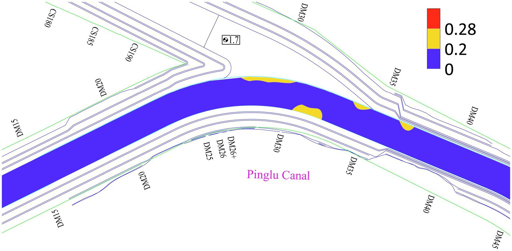 Under Measure IV and the condition where the tributary experiences a 10-year return period flood and the main stream undergoes a 5-year return period flood, the addition of new stilling tooth piers results in minor water surface fluctuations (<0.5 m) within the tributary. Additionally, there are no areas where the transverse flow velocity exceeds the standard value; therefore, the issue of excessive transverse flow velocity has been resolved. Considering that the arrangement of energy dissipation piers downstream of the desilting basin would adversely affect sediment dredging operations in the tributary during later maintenance phases. Additionally, the backwater effect induced by these energy dissipation piers during flood events would increase construction complexity. Furthermore, based on the navigational flow requirements for the canal reach spanning from the Qinjiang River estuary to the Qingnian Junction, the 5-year flood recurrence standard for the Qinjiang tributary has been determined to be more aligned with practical hydrological conditions. Therefore, Measure III is recommended as the preferred solution. The comprehensive rehabilitation outcomes are systematically summarized in Table 4.