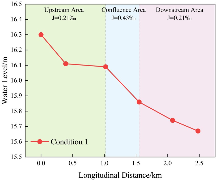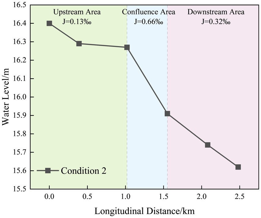 Cross-sections DM26 and DM36 that exhibited significant water level fluctuations were selected for hydrodynamic analysis within the confluence zone. Under the layout of Measure I, the measured fluctuation differentials reached 33.54 cm (DM26) and 33.63 m (DM36). The navigation channel exhibited stabilized hydraulic conditions, with maximum water level oscillations remaining within typical operational thresholds. Additionally, the flow patterns demonstrate favorable hydrodynamic stability. As illustrated in Figure 16, under Experimental Condition 1 (mainstream flow of 1,112 m3/s and tributary flow of 1,380 m3/s), the tributary water level difference was approximately 7.5 m. The longitudinal ratios of the water surface drop in the upstream confluence area, confluence area itself, and downstream confluence area were 0.21 ‰, 0.43 ‰, and 0.21 ‰, respectively. These values were significantly lower than the navigational current condition standard of 2.0 ‰.