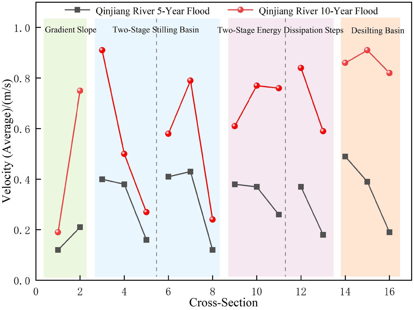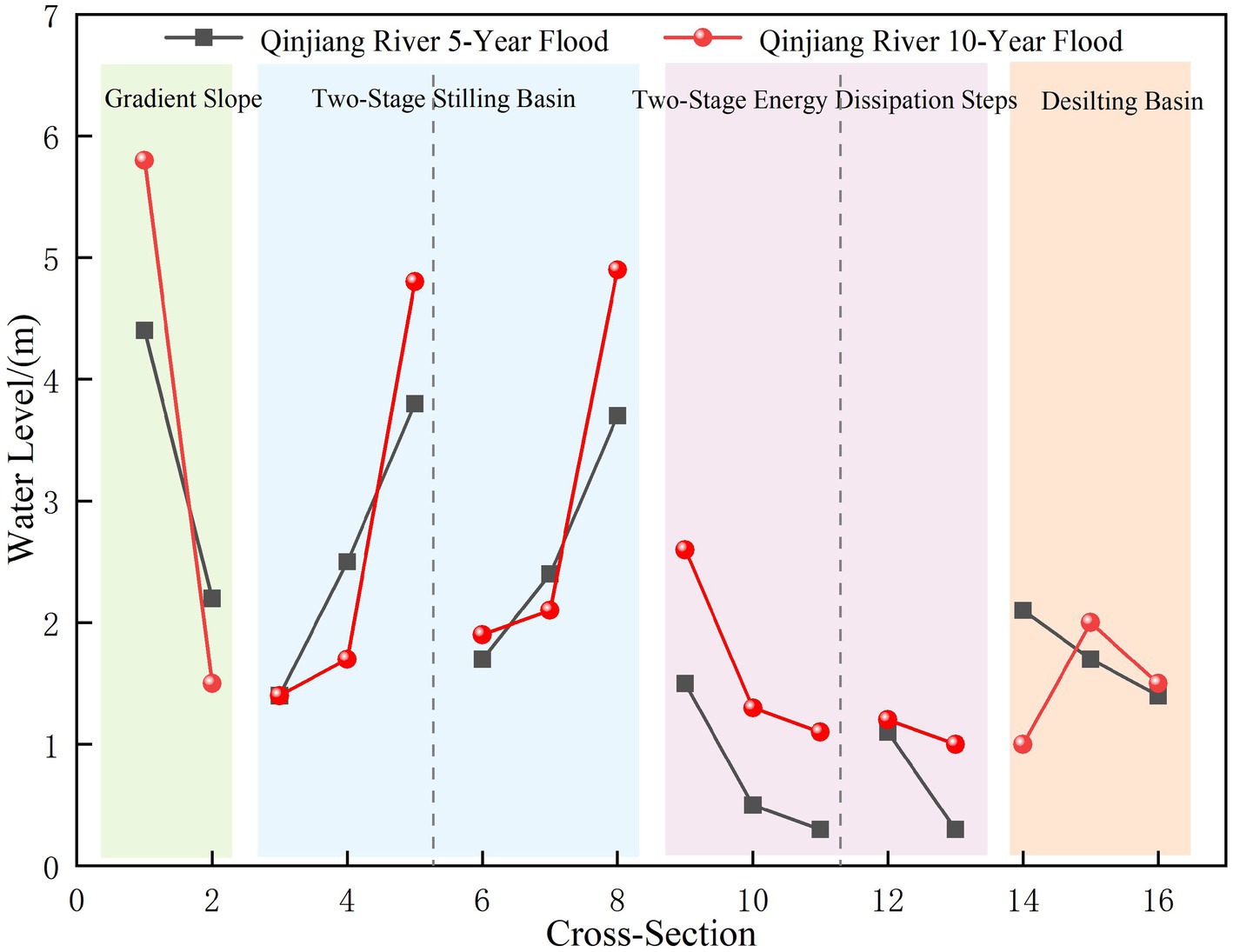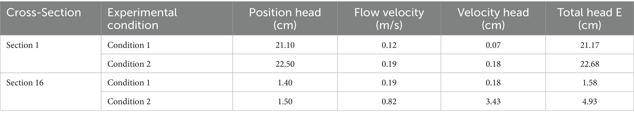 To quantitatively evaluate the energy dissipation effect of Measure III, using the riverbed section at the confluence area as the reference plane, two key control sections were selected: the initial cross-section (Cross-Section 1, located at the starting point of the gentle slope section, where the potential energy is the sum of the total riverbed elevation difference and water depth) and the section after the sedimentation basin (Cross-Section 16, located at the end of the sedimentation basin outlet). Based on the total energy formula for sections derived from the Bernoulli equation ( where E is the total head, Z is the elevation head, is the pressure head, and is the velocity head). The pressure P is set to atmospheric pressure. The total heads at these two sections under flood conditions with five-year return period (Condition 1) and ten-year return period (Condition 2) were calculated, respectively. Subsequently, the energy dissipation efficiency was quantified by the difference in total head, as shown in Table 5.