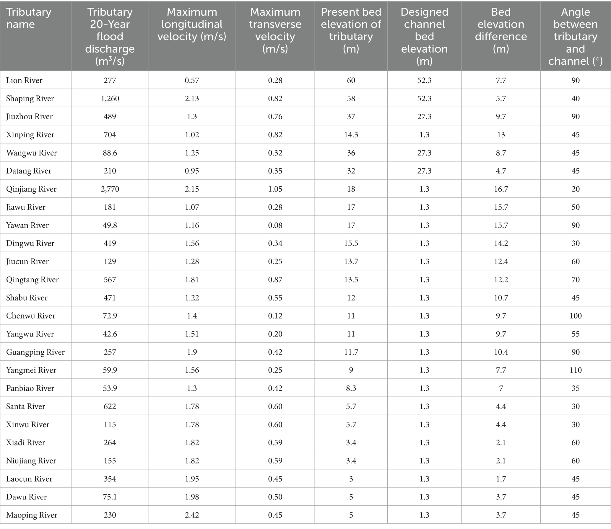 To preserve the Liuqin Expressway Qinjiang Bridge, the alignment design of the Pinglu Canal included a channel realignment at the original confluence of the Qinjiang River. This approach effectively avoids high-angle tributary convergence into the canal. As one of the main tributaries of the Pinglu Canal, the Qinjiang River has a maximum bottom elevation difference of 16.7 meters between its main stream and tributaries at the confluence section. This elevation difference is larger than that of any other tributary of the Pinglu Canal. Such a characteristic will lead to the exceedance of the allowable transverse flow velocity in some parts of the confluence area, thereby exerting a severe impact on the navigation function of the canal, as shown in Table 1 (De Serres et al., 1999). Transverse flow velocities exceeding permissible thresholds have been observed, substantially compromising the canal’s navigation functionality. When a tributary converges with the mainstream, the interaction between the two water currents induces significant alterations in hydrodynamic parameters, including flow velocity, direction, and water level. This interaction frequently results in the formation of complex flow structures, such as vortices and backflows (Liu et al., 2012a, 2012b; Wang et al., 2007; Riley, 2013).
