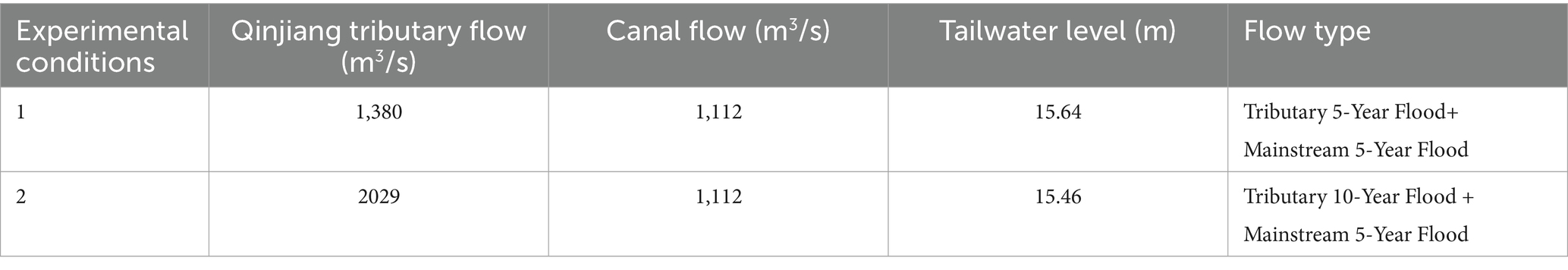 The model was designed to ensure a rational distribution of flow within the system. The inlet section features sufficient length and sinuosity to facilitate appropriate flow adjustments prior to entering the test section during various operational periods. The outlet section is designed with a relatively straightened configuration to ensure similarity in flow dynamics at the downstream boundary of the model. Under low-flow conditions, the thalweg of the tributary shows a minimum water depth of approximately 4 meters, which corresponds to a prototype-to-model scale ratio of 5 cm. This dimensional specification ensures the modeled water depth satisfies the critical threshold of 1.5 cm required to mitigate surface tension interference in physical hydraulic modeling. Based on an analysis of experimental data, the tributary flow velocity during low-flow periods ranges from 0.5 to 2.5 m/s, with a minimum water depth of approximately 4 m, resulting in a scaled model Reynolds number of ReM = 2000. This scaling ratio ensures the flood-condition model flow maintains ReM > 1,000, satisfying the turbulence initiation criterion for open-channel flows. Given that all hydrological configurations in this study represent flood scenarios in tributary systems, the model has been confirmed to satisfy the turbulence similarity criteria required for dynamic similitude in hydraulic model testing. Detailed experimental parameters are systematically presented in Table 2.