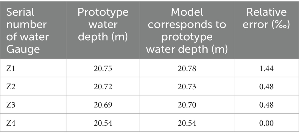 The model experiment was verified through water-level testing to ensure similar flow conditions. Four water gauges were deployed downstream of the Dongsheng Sluice Gate in the prototype Qinjiang River channel. Instantaneous water surface profiles were monitored using field-measured low-flow discharge data (62.0m3/s) recorded at the canal-river confluence in August 2022. Model validation experiments comparing prototype and model water surface profiles demonstrated strong agreement, with high consistency in longitudinal slope alignment. Verification results are summarized in Table 3. Quantitative comparison analysis showed that both water level deviations and flood stage discrepancies remained within ±0.05 m and did not exceed the ±0.10 m threshold, indicating strong similarity in resistance characteristics between the model and prototype. This alignment satisfies the similarity criteria for fixed-bed river engineering models. Consequently, the validated model demonstrates adequate fidelity to support subsequent investigations into hydrodynamic behavior assessments and engineered mitigation scheme evaluations.
