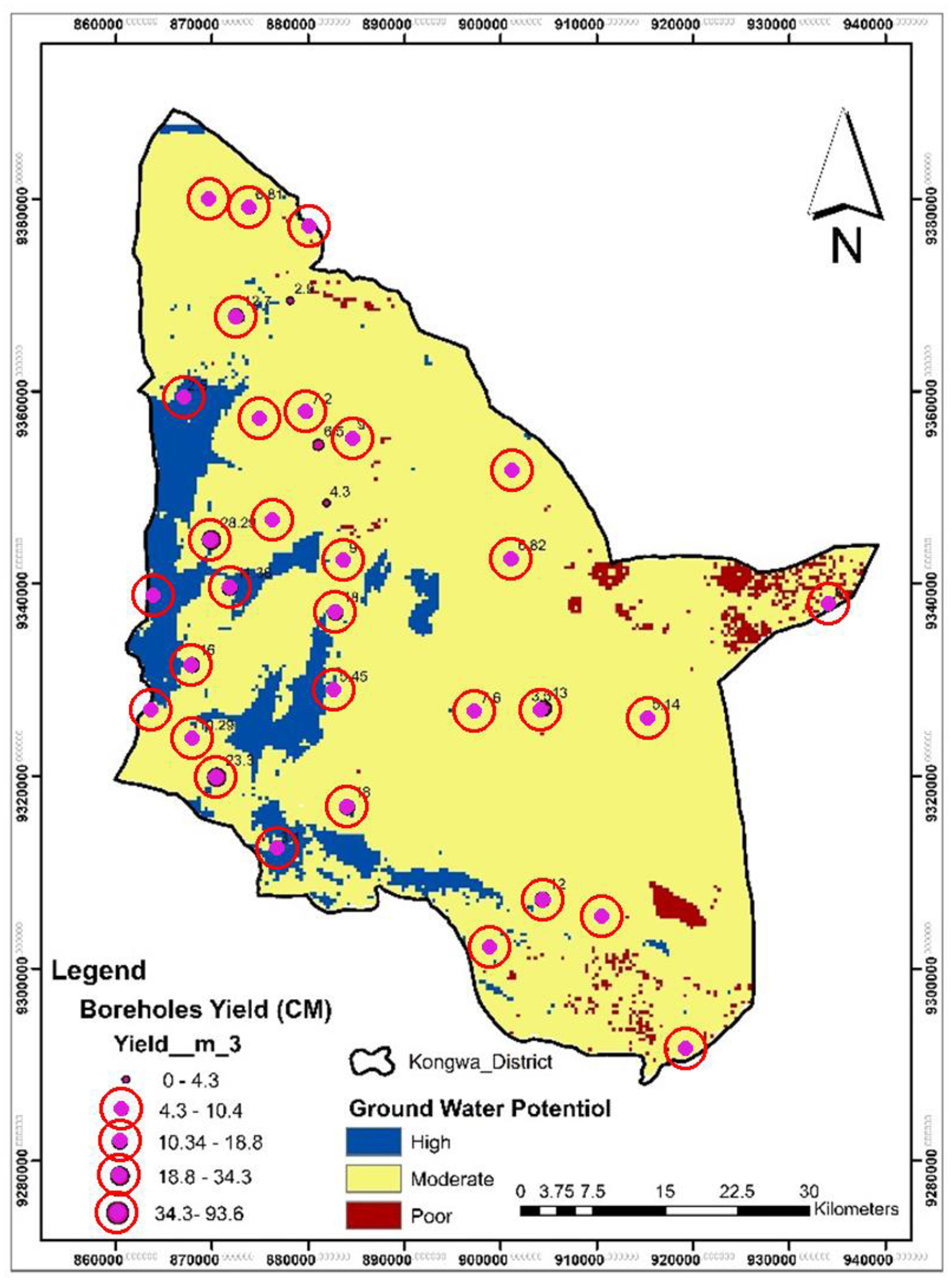 The groundwater potential zone map was prepared by overlaying of cumulative weight assigned to all the thematic layers (geomorphology, drainage, drainage density, lineaments, lineaments density, soil and slope) using the weighted overlay techniques in spatial analysis tool of Arc GIS 10.5 method. In the process of weighted overlay analysis each thematic layer has been assigned by ranking and weightage based on their water holding capacity (Table 2). Higher and lower weightages were given to higher and low potential of groundwater, respectively. After assigning ranking and weightage of each layer were added and sum grouped into potential zone of groundwater. All the layers were converted into raster format and overlaid. Based on weighted overlay analysis the study area classified into three classes such as high, moderate and poor groundwater potential (Figure 10). Likewise, the findings indicate that borehole yields in Kongwa District are generally low, moderate to high, ranging between 0.2 and 3.5 liters per second (l/s), with the majority producing less than 1.5 l/s. Boreholes are categorized as low-yield (< 1 l/s), moderate-yield (1–2.5 l/s), and high-yield (>2.5 l/s, though rare in Kongwa).