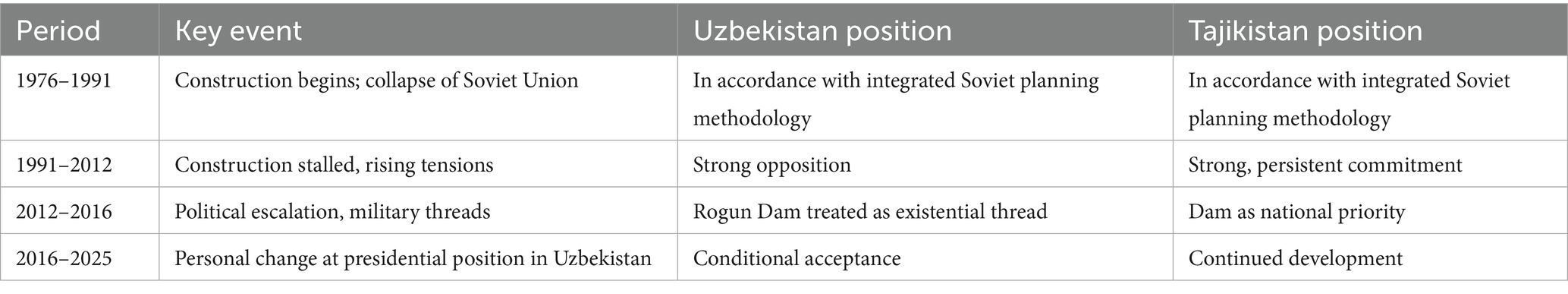 However, these studies have not systematically examined how leadership transitions translate into concrete policy changes in transboundary water governance. Our research fills this gap by providing the first comprehensive analysis of how Mirziyoyev’s presidency fundamentally altered the course of the Rogun dispute, demonstrating that domestic political transformation can override longstanding interstate tensions more effectively than traditional diplomatic frameworks.